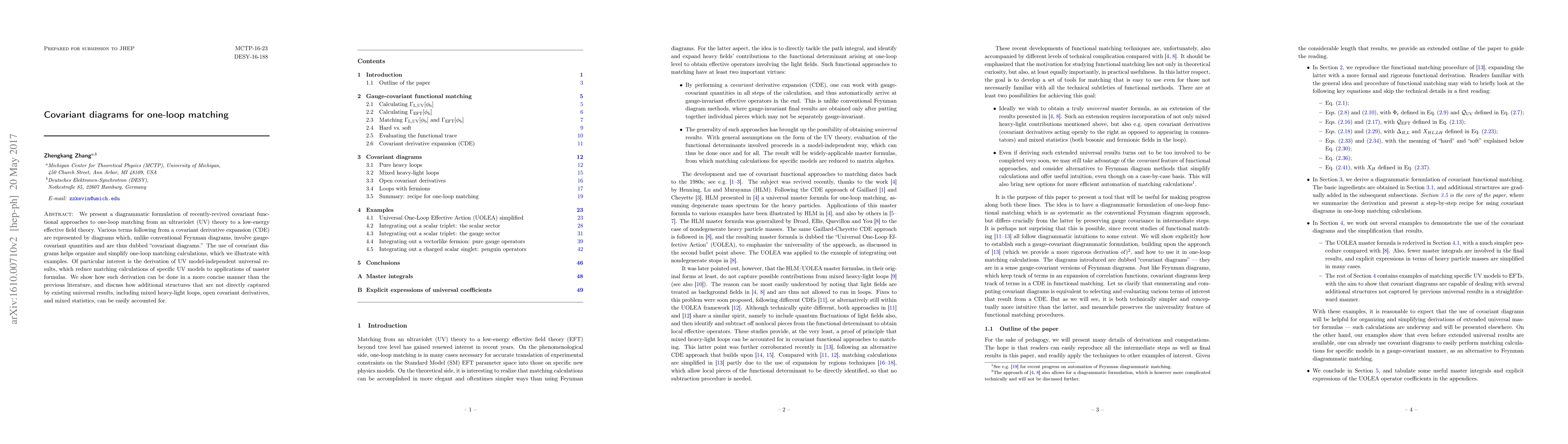 This paper introduces a diagrammatic method for one-loop matching calculations using "covariant diagrams," which utilize gauge-covariant quantities to simplify and organize the process. It demonstrates how these diagrams can derive universal results more concisely than previous methods, and can account for additional structures like mixed heavy-light loops.