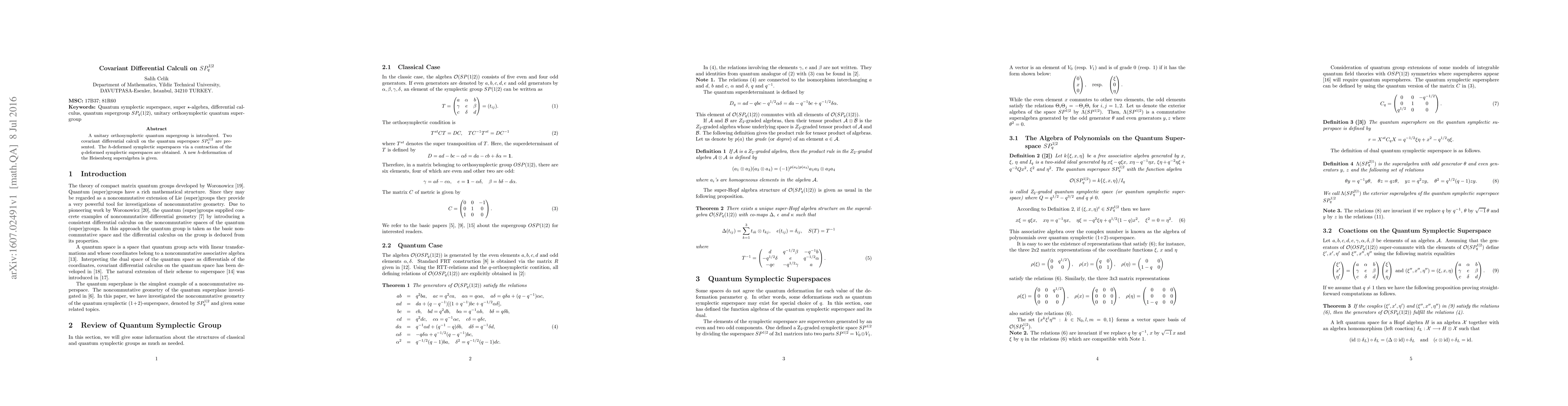 This paper introduces a unitary orthosymplectic quantum supergroup and presents two covariant differential calculi on the quantum superspace $SP_q^{1|2}$. It also explores $h$-deformed symplectic superspaces and a new $h$-deformation of the Heisenberg superalgebra through the contraction of $q$-deformed symplectic superspaces.