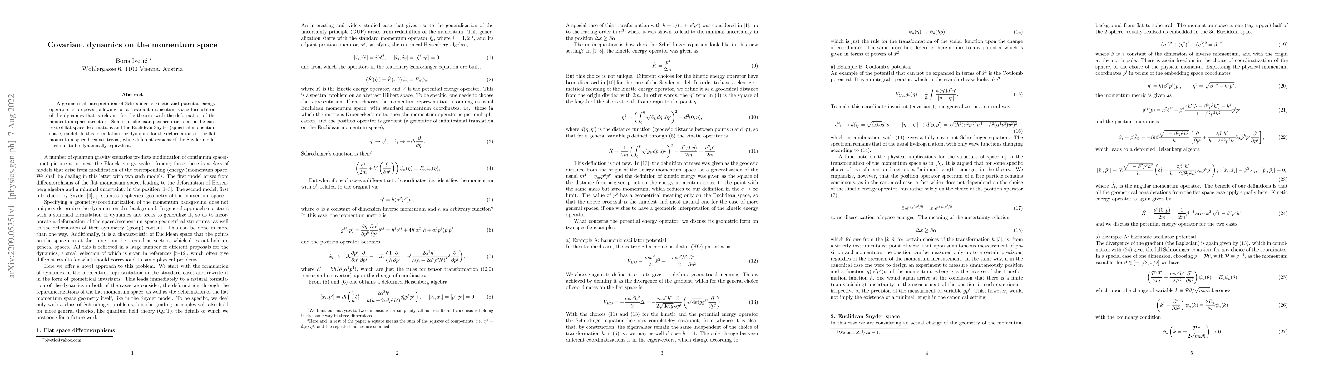 This paper proposes a covariant momentum space formulation of quantum dynamics, interpreting Schrödinger's kinetic and potential energy operators geometrically. It simplifies the dynamics of flat momentum space deformations and shows that different versions of the Snyder model are dynamically equivalent.