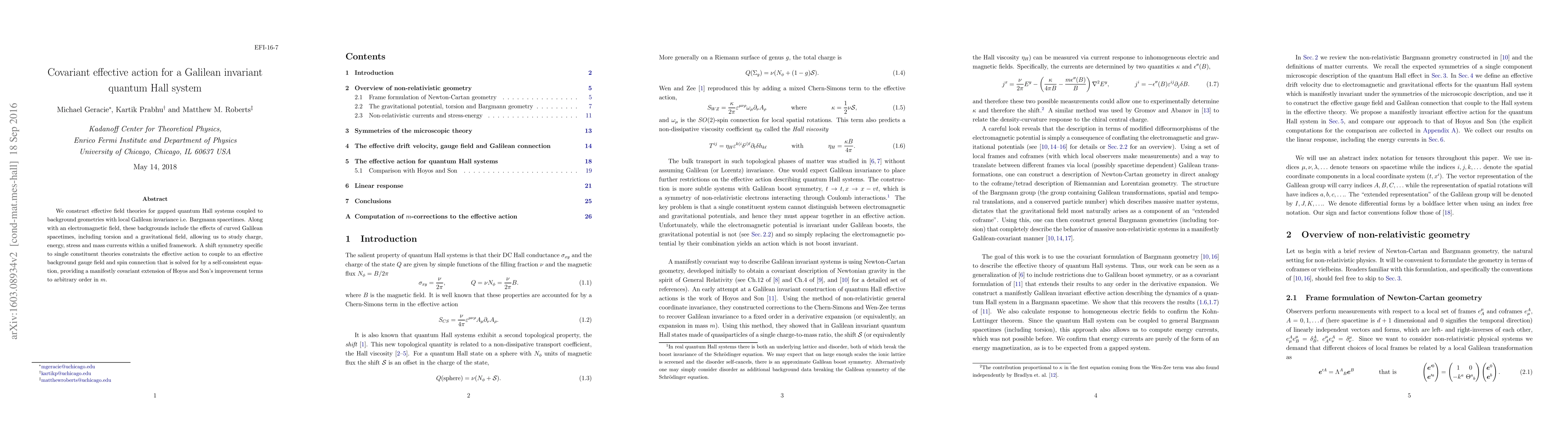 This paper constructs effective field theories for quantum Hall systems with Galilean invariance, incorporating electromagnetic fields and curved spacetimes. It derives a covariant effective action that accounts for charge, energy, stress, and mass currents, utilizing a shift symmetry to solve for background gauge fields and spin connections.