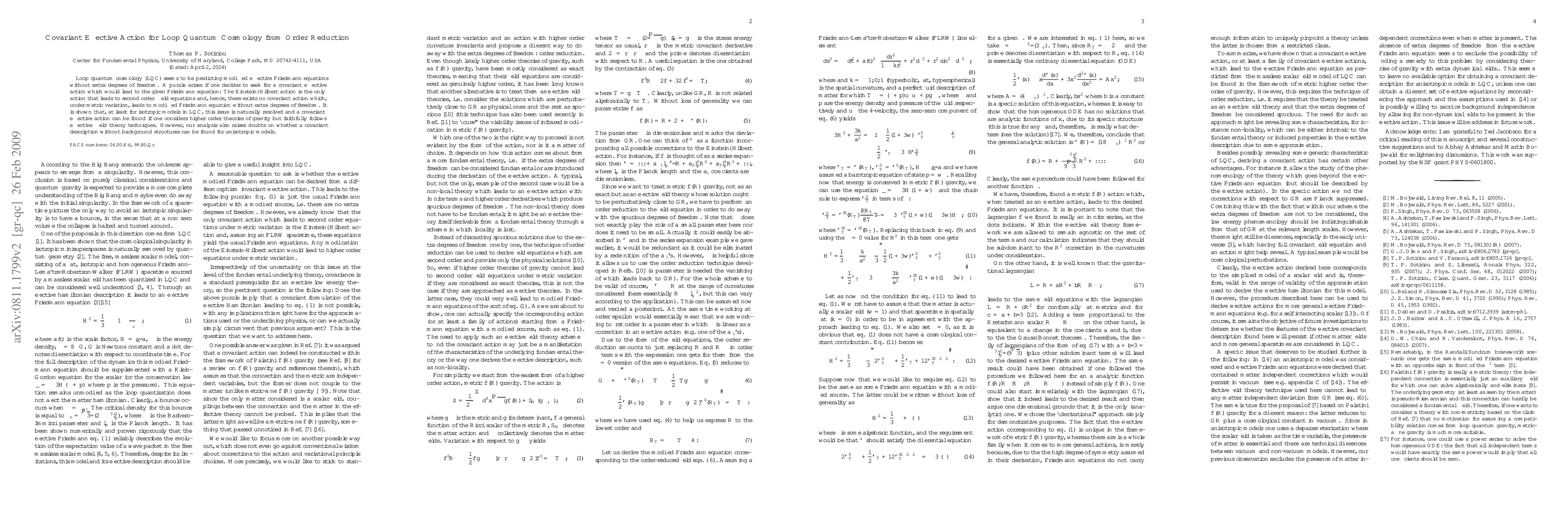 Loop quantum cosmology (LQC) seems to be predicting modified effective Friedmann equations without extra degrees of freedom. A puzzle arises if one decides to seek for a covariant effective action which would lead to the given Friedmann equation: The Einstein--Hilbert action is the only action that leads to second order field equations and, hence, there exists no covariant action which, under metric variation, leads to modified Friedmann equation without extra degrees of freedom. It is shown that, at least for isotropic models in LQC, this issue is naturally resolved and a covariant effective action can be found if one considers higher order theories of gravity but faithfully follows effective field theory techniques. However, our analysis also raises doubts on whether a covariant description without background structures can be found for anisotropic models.