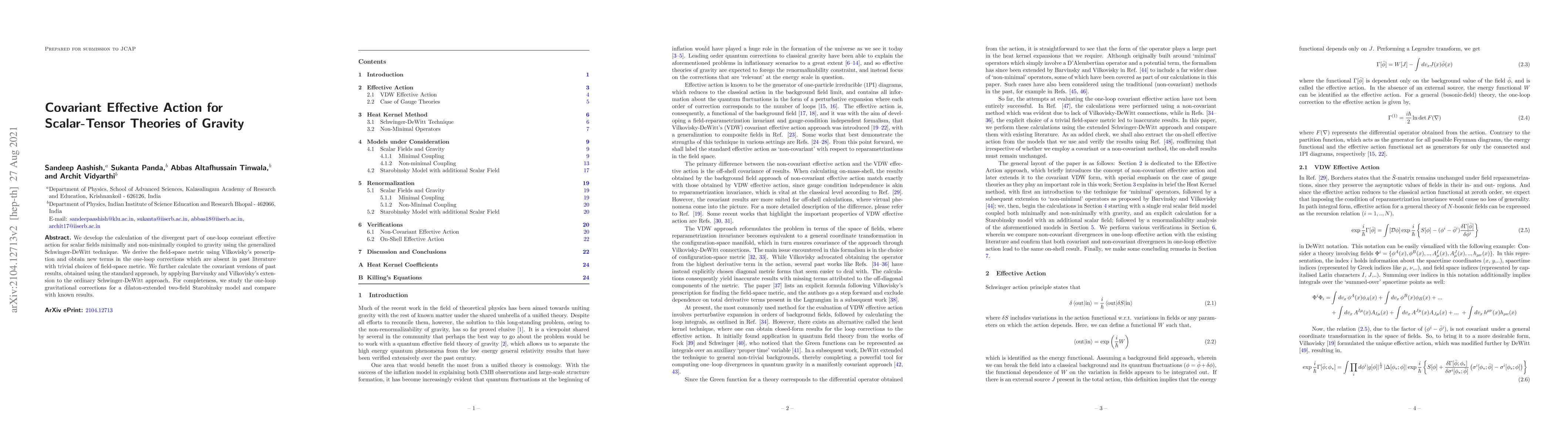 This paper develops the one-loop covariant effective action for scalar-tensor gravity, deriving new terms using Vilkovisky's prescription and comparing with standard approaches. It also examines the dilaton-extended Starobinsky model for gravitational corrections.