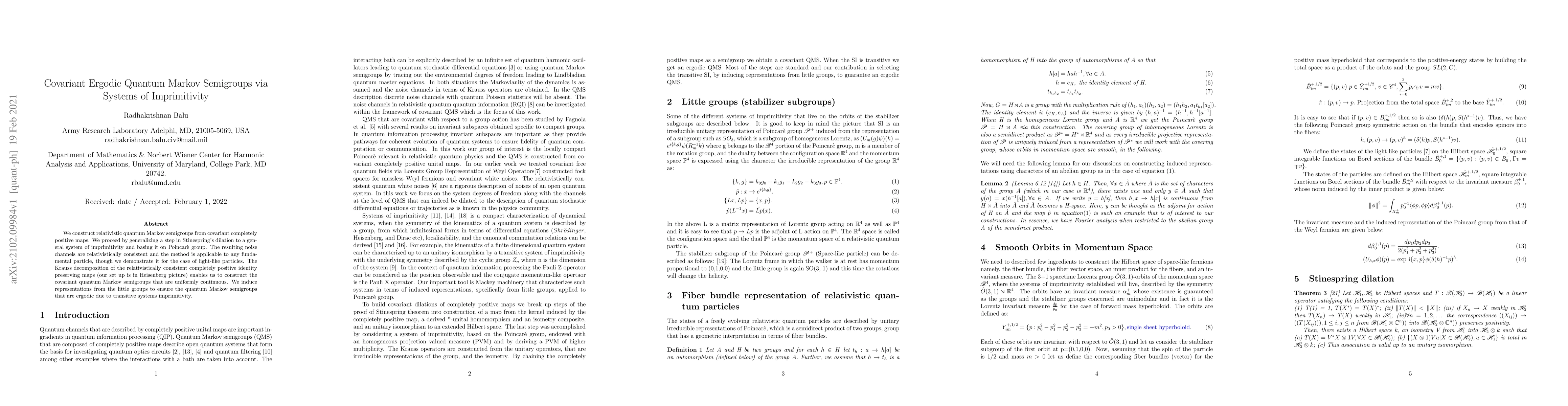 This paper constructs covariant ergodic quantum Markov semigroups from covariant completely positive maps, generalizing a step in Stinespring's dilation to systems of imprimitivity based on the Poincaré group. The method is demonstrated for light-like particles and ensures relativistic consistency and ergodicity through representations from little groups.