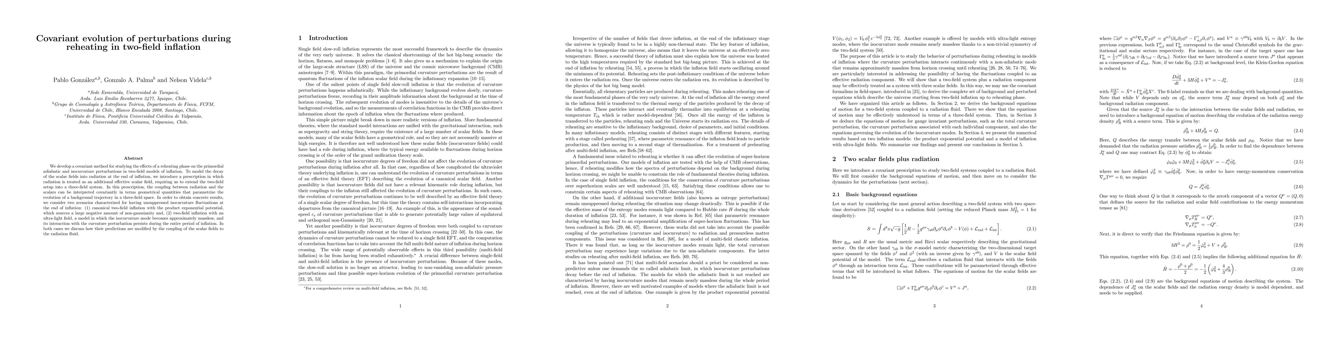 We develop a covariant method for studying the effects of a reheating phase on the primordial adiabatic and isocurvature perturbations in two-field models of inflation. To model the decay of the scalar fields into radiation at the end of inflation, we introduce a prescription in which radiation is treated as an additional effective scalar field, requiring us to extend the two-field setup into a three-field system. In this prescription, the coupling between radiation and the scalars can be interpreted covariantly in terms geometrical quantities that parametrize the evolution of a background trajectory in a three-field space. In order to obtain concrete results, we consider two scenarios characterized for having unsuppressed isocurvature fluctuations at the end of inflation: (1) canonical two-field inflation with the product exponential potential, which sources a large negative amount of non-gaussianity and, (2) two-field inflation with an ultra-light field, a model in which the isocurvature mode becomes approximately massless, and its interaction with the curvature perturbation persists during the entire period of inflation. In both cases we discuss how their predictions are modified by the coupling of the scalar fields to the radiation fluid.