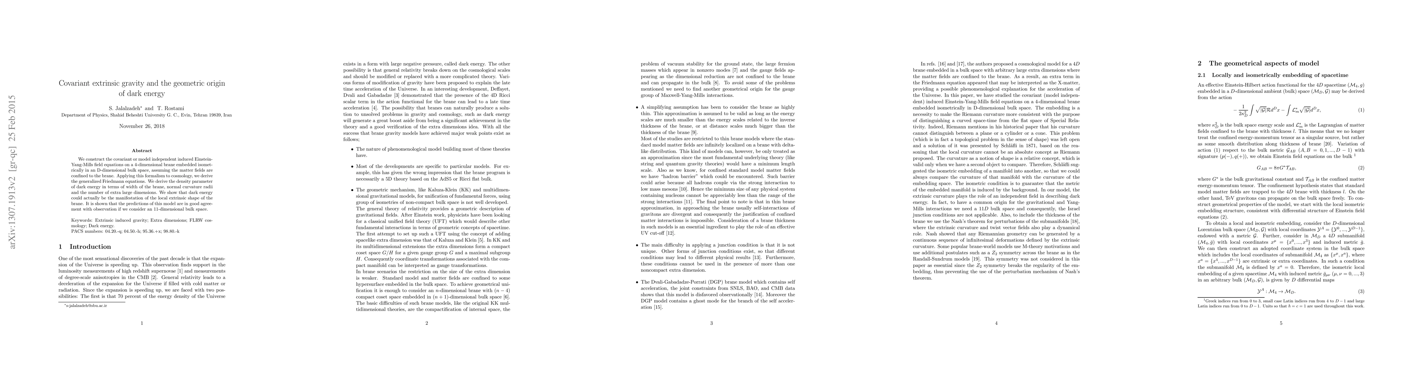 We construct the covariant or model independent induced Einstein-Yang-Mills field equations on a 4-dimensional brane embedded isometrically in an D-dimensional bulk space, assuming the matter fields are confined to the brane. Applying this formalism to cosmology, we derive the generalized Friedmann equations. We derive the density parameter of dark energy in terms of width of the brane, normal curvature radii and the number of extra large dimensions. We show that dark energy could actually be the manifestation of the local extrinsic shape of the brane. It is shown that the predictions of this model are in good agreement with observation if we consider an 11-dimensional bulk space.