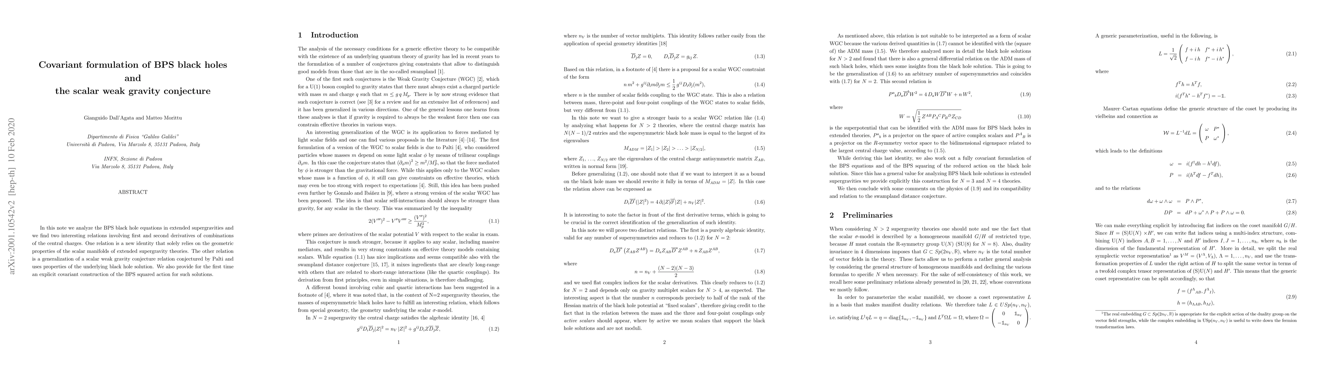 This paper explores BPS black hole equations in extended supergravity theories, revealing new geometric identities and generalizing the scalar weak gravity conjecture. It also presents a covariant construction of the BPS squared action for these solutions.