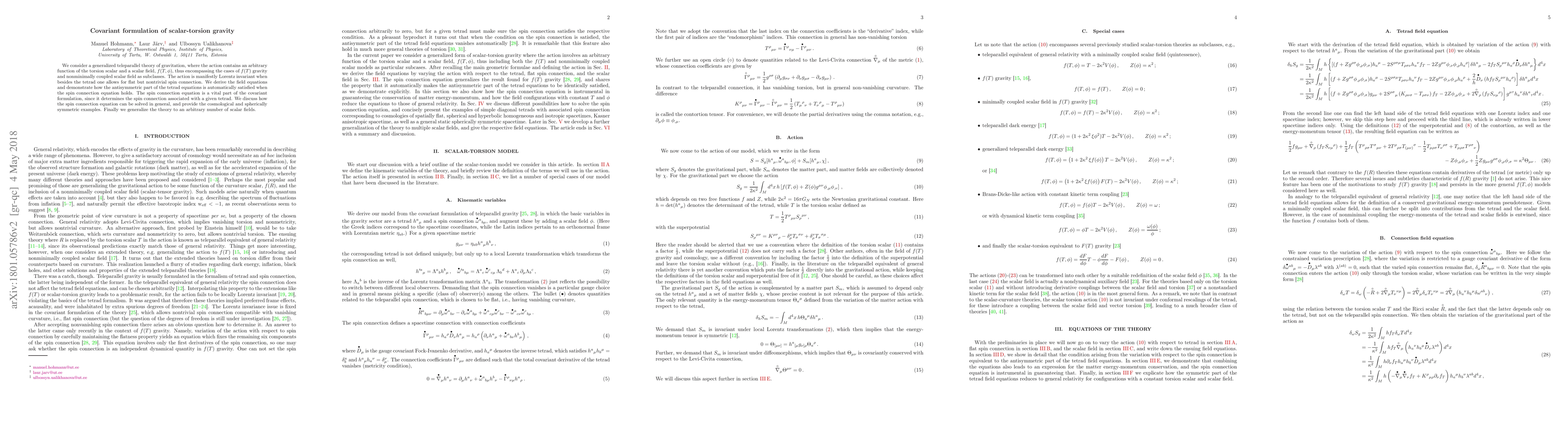 This paper develops a covariant formulation of scalar-torsion gravity, encompassing $f(T)$ gravity and nonminimally coupled scalar fields. It derives field equations from a generalized teleparallel action and discusses the role of the spin connection equation in determining the theory's dynamics, providing examples for cosmological and spherically symmetric scenarios.