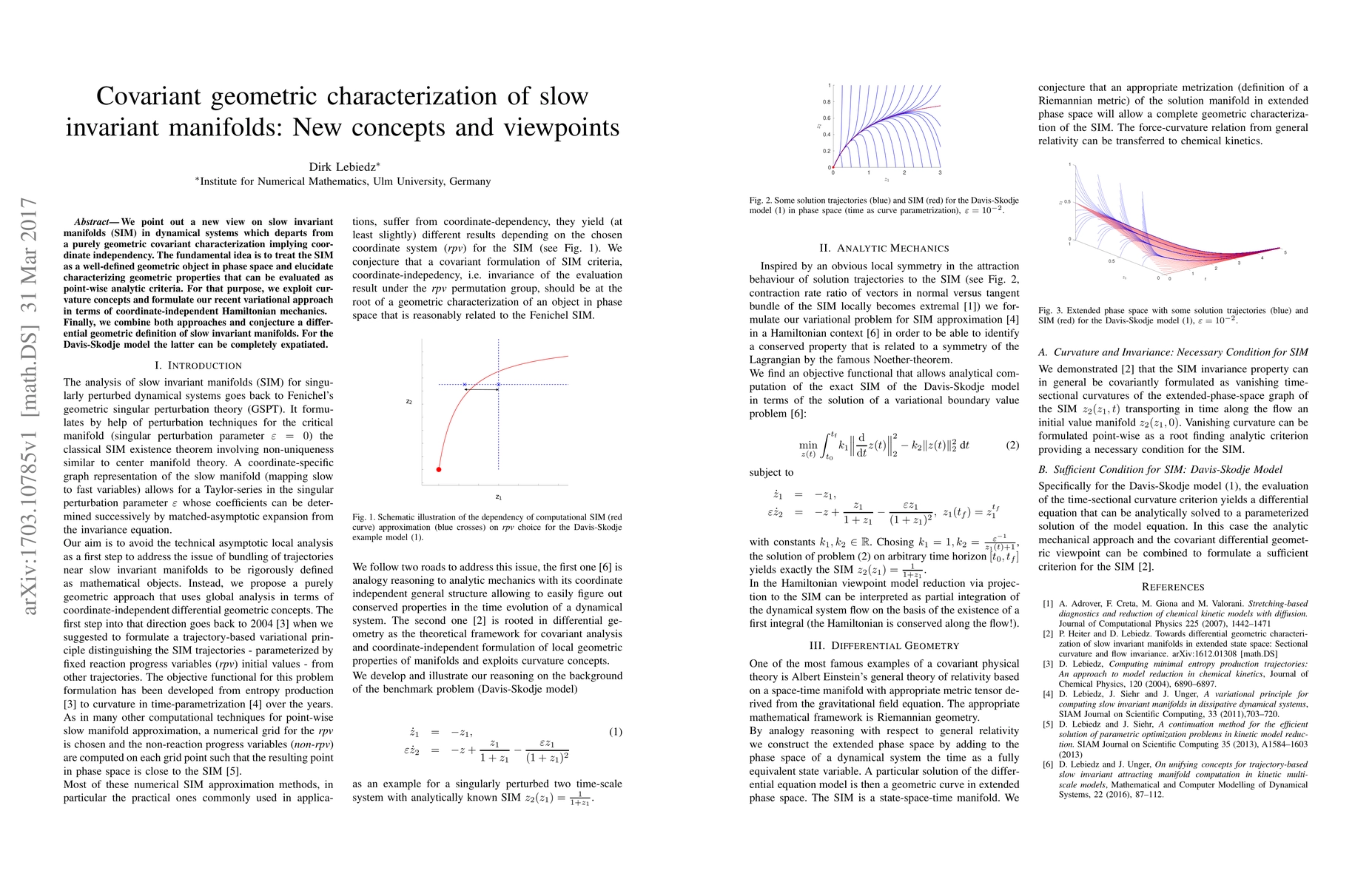 This paper introduces a novel covariant geometric characterization of slow invariant manifolds (SIM) in dynamical systems, emphasizing their inherent geometric properties in phase space and proposing a coordinate-independent definition based on curvature concepts and Hamiltonian mechanics. The authors conjecture a differential geometric definition and demonstrate its application through the Davis-Skodje model.