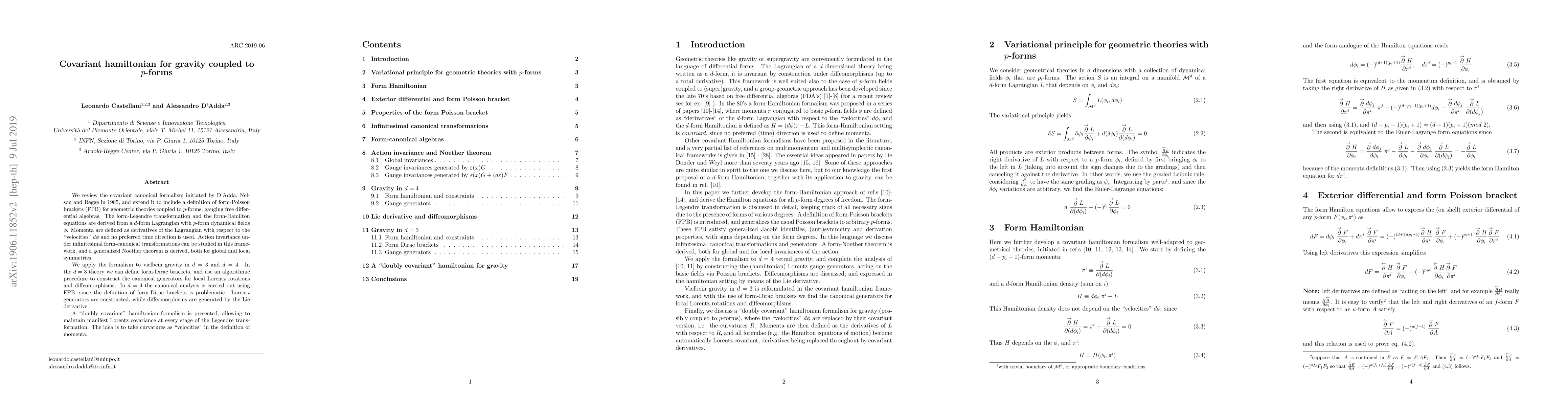 We review the covariant canonical formalism initiated by D'Adda, Nelson and Regge in 1985, and extend it to include a definition of form-Poisson brackets (FPB) for geometric theories coupled to $p$-forms, gauging free differential algebras. The form-Legendre transformation and the form-Hamilton equations are derived from a $d$-form Lagrangian with $p$-form dynamical fields $\phi$. Momenta are defined as derivatives of the Lagrangian with respect to the "velocities" $d\phi$ and no preferred time direction is used. Action invariance under infinitesimal form-canonical transformations can be studied in this framework, and a generalized Noether theorem is derived, both for global and local symmetries. We apply the formalism to vielbein gravity in $d=3$ and $d=4$. In the $d=3$ theory we can define form-Dirac brackets, and use an algorithmic procedure to construct the canonical generators for local Lorentz rotations and diffeomorphisms. In $d=4$ the canonical analysis is carried out using FPB, since the definition of form-Dirac brackets is problematic. Lorentz generators are constructed, while diffeomorphisms are generated by the Lie derivative. A "doubly covariant" hamiltonian formalism is presented, allowing to maintain manifest Lorentz covariance at every stage of the Legendre transformation. The idea is to take curvatures as "velocities" in the definition of momenta.