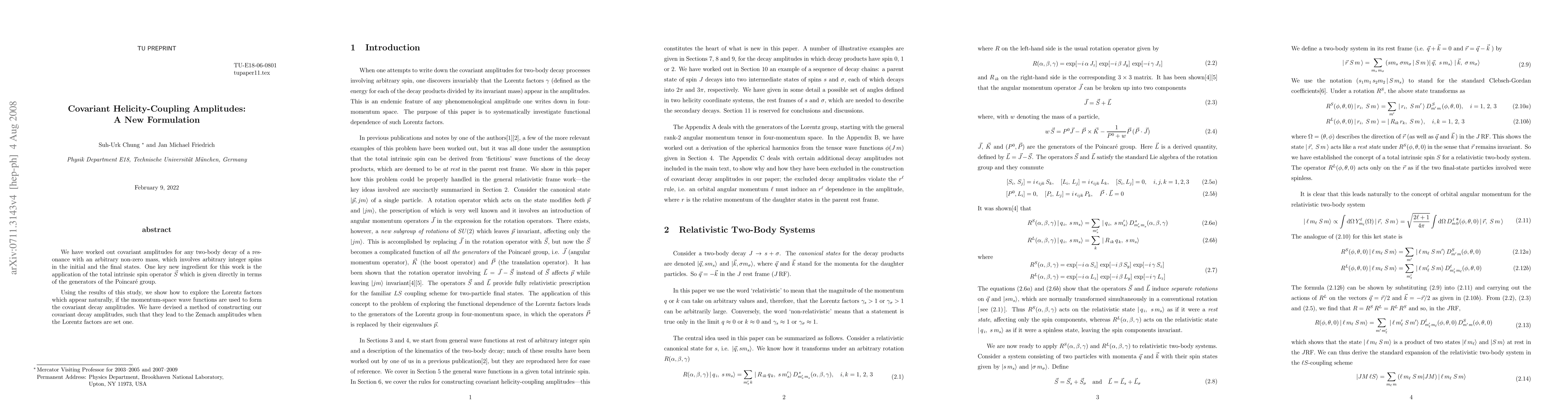 We have worked out covariant amplitudes for any two-body decay of a resonance with an arbitrary non-zero mass, which involves arbitrary integer spins in the initial and the final states. One key new ingredient for this work is the application of the total intrinsic spin operator $\vec S$ which is given directly in terms of the generators of the Poincar\'e group. Using the results of this study, we show how to explore the Lorentz factors which appear naturally, if the momentum-space wave functions are used to form the covariant decay amplitudes. We have devised a method of constructing our covariant decay amplitudes, such that they lead to the Zemach amplitudes when the Lorentz factors are set one.