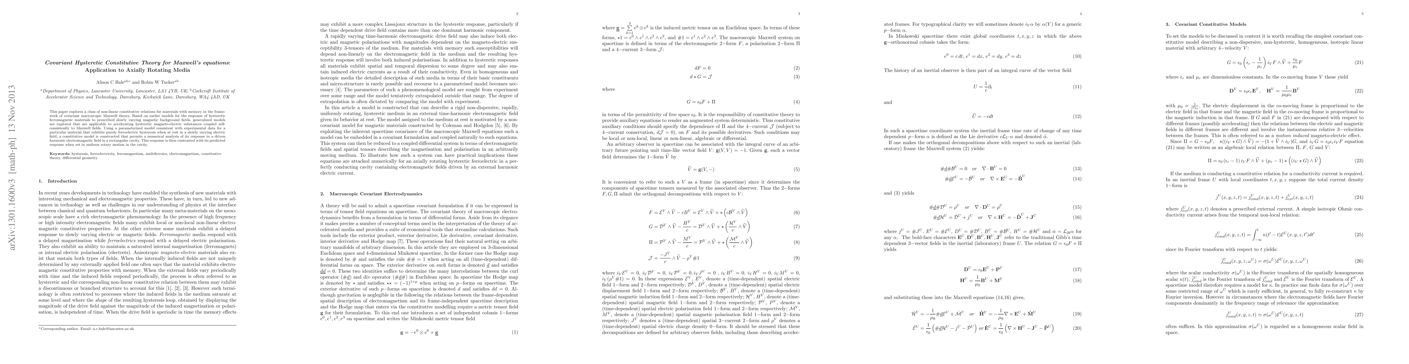 This paper develops a covariant hysteretic constitutive theory for Maxwell's equations, applying it to axially rotating media with memory effects. It contrasts the material's response to a driven electromagnetic field at rest versus when it is uniformly rotating.