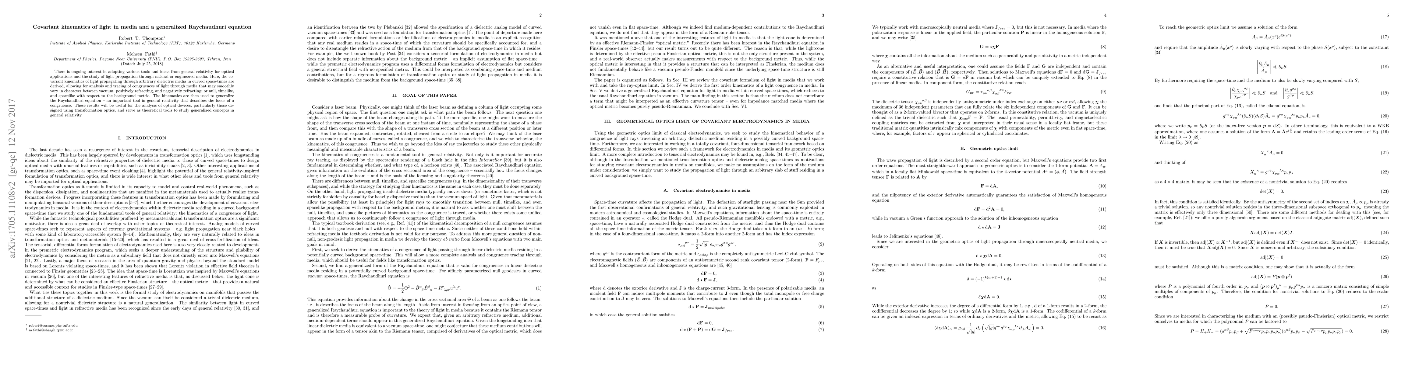 This paper derives the covariant kinematics of light in arbitrary dielectric media within curved space-times, enabling the analysis of light propagation through varying media. It also generalizes the Raychaudhuri equation to describe the focusing of light congruences, providing theoretical tools for optical devices and concepts in general relativity.