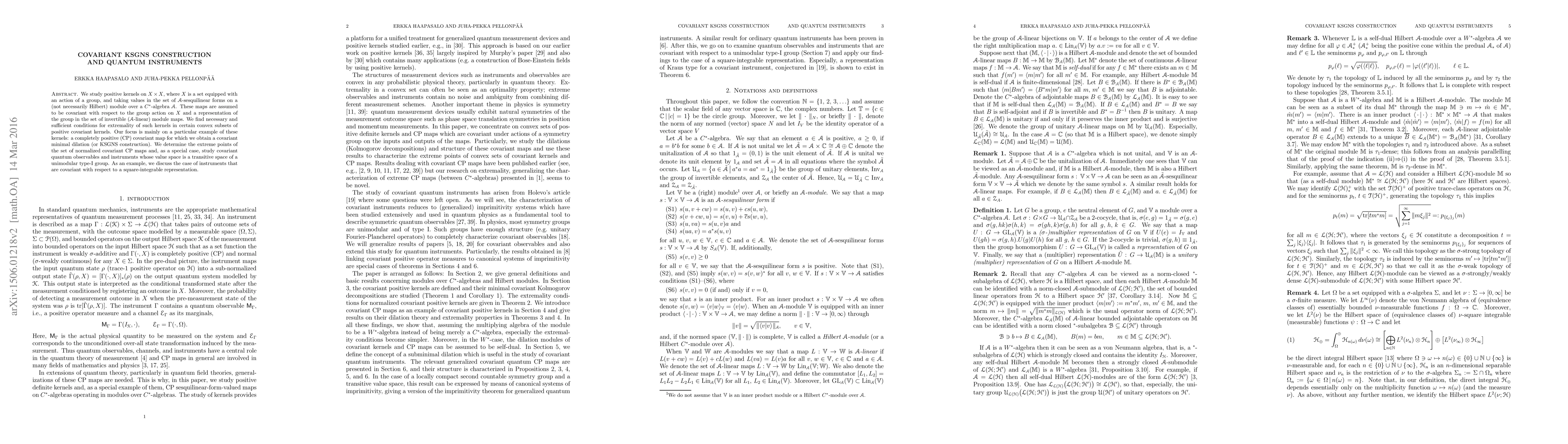We study positive kernels on $X\times X$, where $X$ is a set equipped with an action of a group, and taking values in the set of $\mathcal A$-sesquilinear forms on a (not necessarily Hilbert) module over a $C^*$-algebra $\mathcal A$. These maps are assumed to be covariant with respect to the group action on $X$ and a representation of the group in the set of invertible ($\mathcal A$-linear) module maps. We find necessary and sufficient conditions for extremality of such kernels in certain convex subsets of positive covariant kernels. Our focus is mainly on a particular example of these kernels: a completely positive (CP) covariant map for which we obtain a covariant minimal dilation (or KSGNS construction). We determine the extreme points of the set of normalized covariant CP maps and, as a special case, study covariant quantum observables and instruments whose value space is a transitive space of a unimodular type-I group. As an example, we discuss the case of instruments that are covariant with respect to a square-integrable representation.