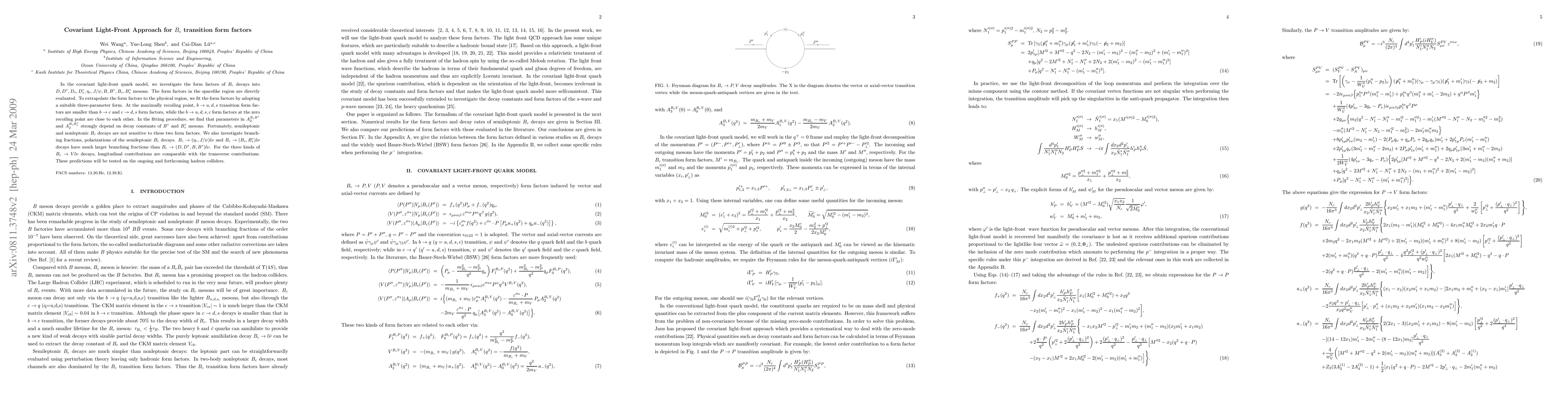 This paper employs a covariant light-front quark model to study $B_c$ decay form factors into various mesons, finding $b\to u,d,s$ transitions are smaller than $b\to c$ and $c\to d,s$ transitions. The study predicts larger branching fractions for semileptonic $B_c$ decays into $\eta_c, J/\psi$, and $B_s$ mesons, with significant contributions from both longitudinal and transverse polarizations.