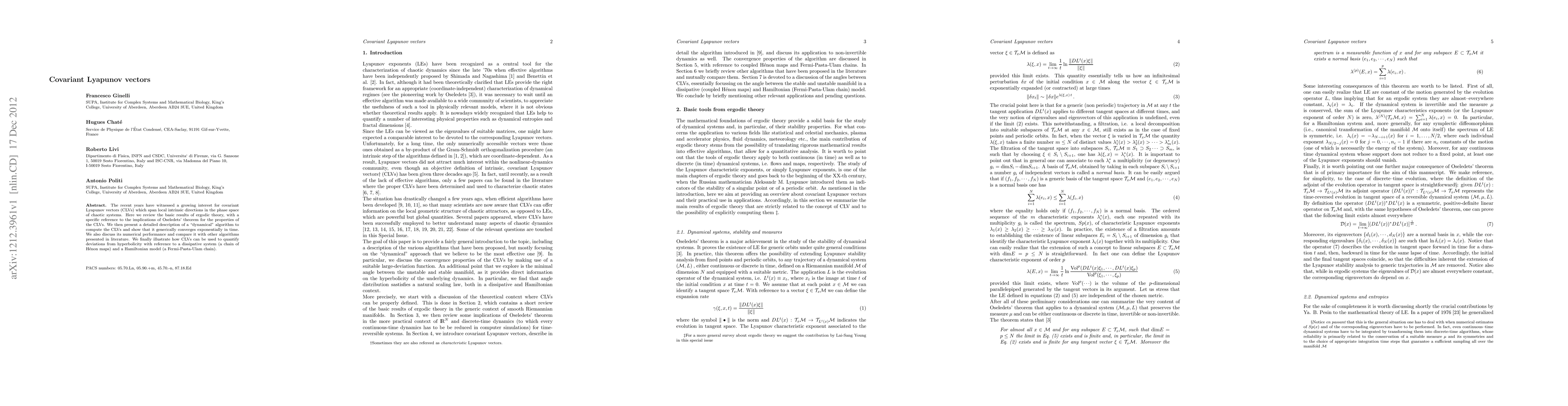 The recent years have witnessed a growing interest for covariant Lyapunov vectors (CLVs) which span local intrinsic directions in the phase space of chaotic systems. Here we review the basic results of ergodic theory, with a specific reference to the implications of Oseledets' theorem for the properties of the CLVs. We then present a detailed description of a "dynamical" algorithm to compute the CLVs and show that it generically converges exponentially in time. We also discuss its numerical performance and compare it with other algorithms presented in literature. We finally illustrate how CLVs can be used to quantify deviations from hyperbolicity with reference to a dissipative system (a chain of H\'enon maps) and a Hamiltonian model (a Fermi-Pasta-Ulam chain).