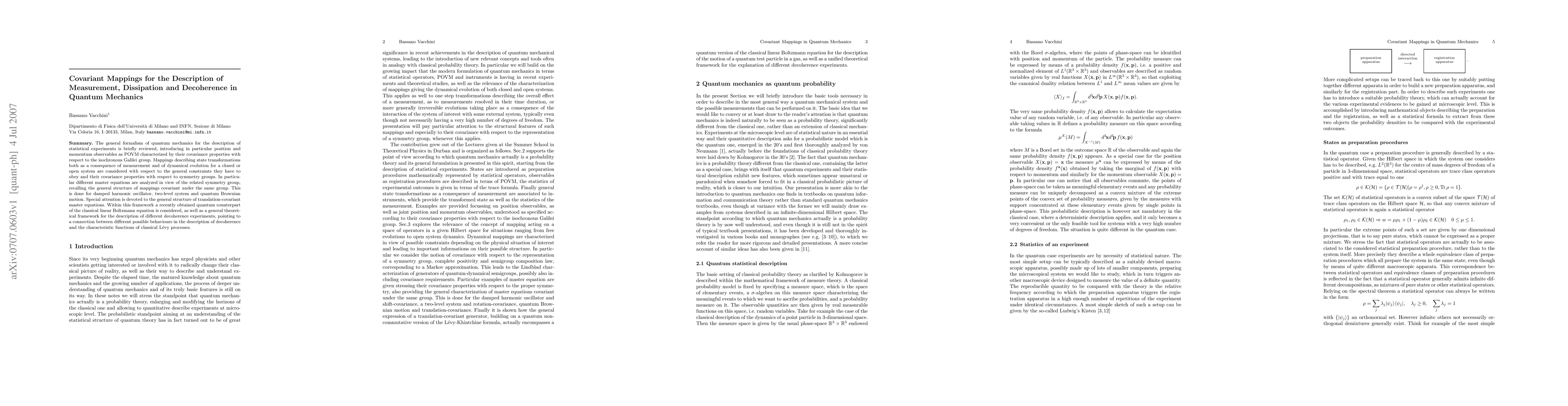 This paper reviews quantum mechanics formalism, focusing on covariant mappings for measurement, dissipation, and decoherence. It analyzes master equations for systems like the damped harmonic oscillator, emphasizing translation-covariant structures and their connection to decoherence and classical L\'evy processes.