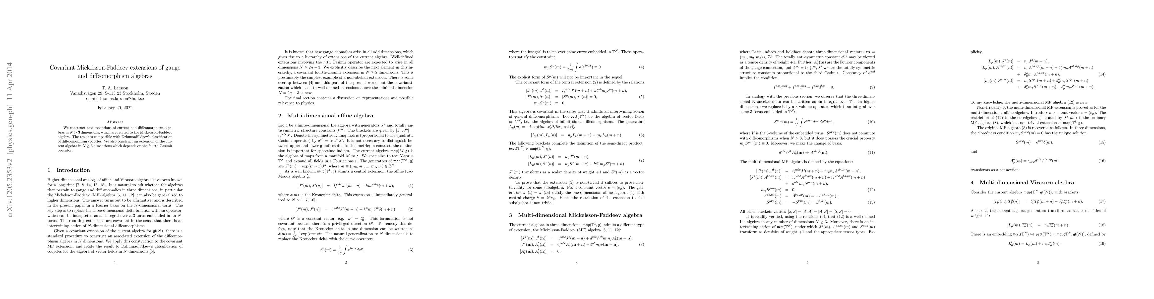 This paper constructs new covariant Mickelsson-Faddeev extensions of current and diffeomorphism algebras in N>3 dimensions, aligning with Dzhumadil'daev's classification, and introduces an N>=5 dimension extension dependent on the fourth Casimir operator.