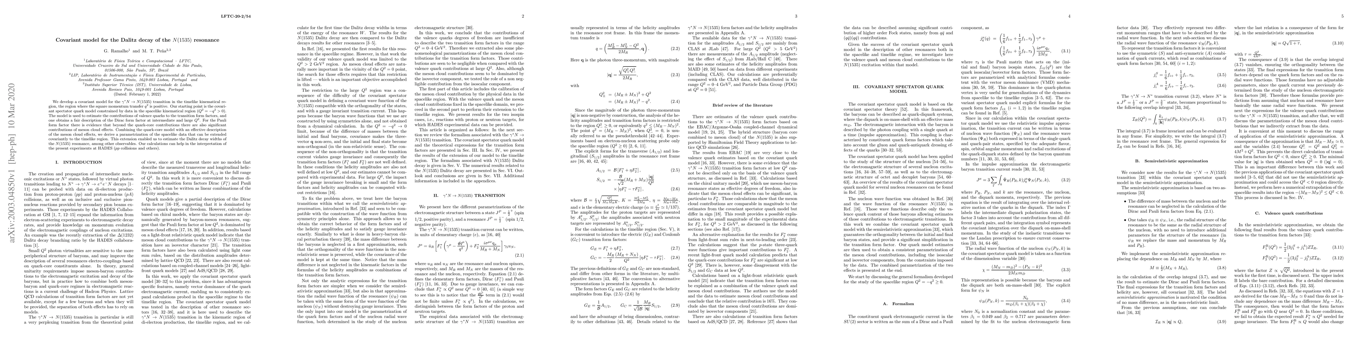 We develop a covariant model for the $\gamma^\ast N \to N(1535)$ transition in the timelike kinematical region, the region where the square momentum transfer $q^2$ is positive. Our starting point is the covariant spectator quark model constrained by data in the spacelike kinematical region ($Q^2 = -q^2 >0$). The model is used to estimate the contributions of valence quarks to the transition form factors, and one obtains a fair description of the Dirac form factor at intermediate and large $Q^2$. For the Pauli form factor there is evidence that beyond the quark-core contributions there are also significant contributions of meson cloud effects. Combining the quark-core model with an effective description of the meson cloud effects, we derive a parametrization of the spacelike data that can be extended covariantly to the timelike region. This extension enabled us to estimate the Dalitz decay widths of the $N(1535)$ resonance, among other observables. Our calculations can help in the interpretation of the present experiments at HADES ($pp$ collisions and others).