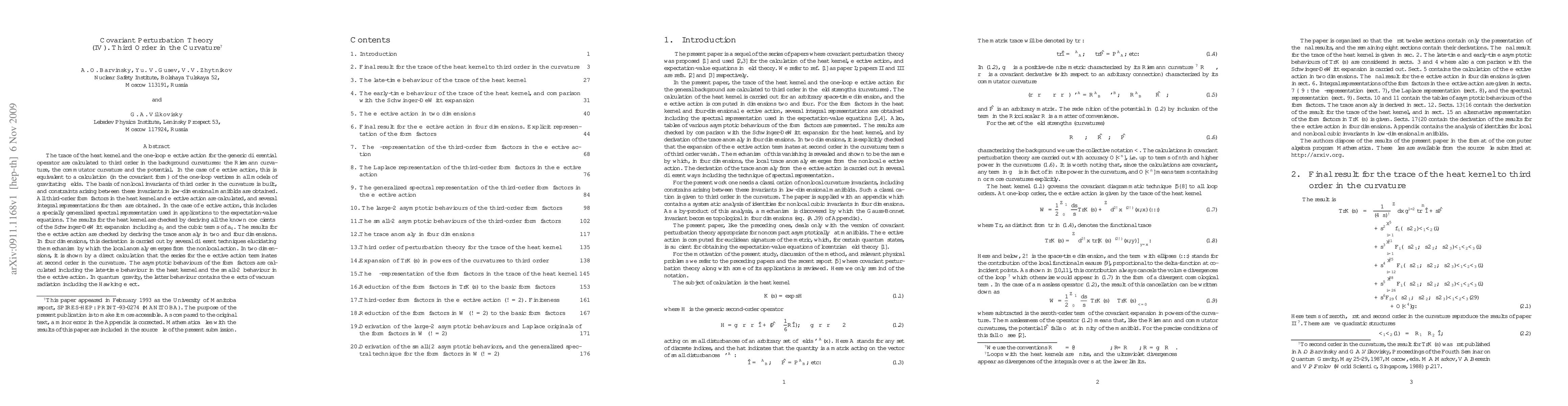 The trace of the heat kernel and the one-loop effective action for the generic differential operator are calculated to third order in the background curvatures: the Riemann curvature, the commutator curvature and the potential. In the case of effective action, this is equivalent to a calculation (in the covariant form) of the one-loop vertices in all models of gravitating fields. The basis of nonlocal invariants of third order in the curvature is built, and constraints arising between these invariants in low-dimensional manifolds are obtained. All third-order form factors in the heat kernel and effective action are calculated, and several integral representations for them are obtained. In the case of effective action, this includes a specially generalized spectral representation used in applications to the expectation-value equations. The results for the heat kernel are checked by deriving all the known coefficients of the Schwinger-DeWitt expansion including $a_3$ and the cubic terms of $a_4$. The results for the effective action are checked by deriving the trace anomaly in two and four dimensions. In four dimensions, this derivation is carried out by several different techniques elucidating the mechanism by which the local anomaly emerges from the nonlocal action. In two dimensions, it is shown by a direct calculation that the series for the effective action terminates at second order in the curvature. The asymptotic behaviours of the form factors are calculated including the late-time behaviour in the heat kernel and the small-$\Box$ behaviour in the effective action. In quantum gravity, the latter behaviour contains the effects of vacuum radiation including the Hawking effect.
