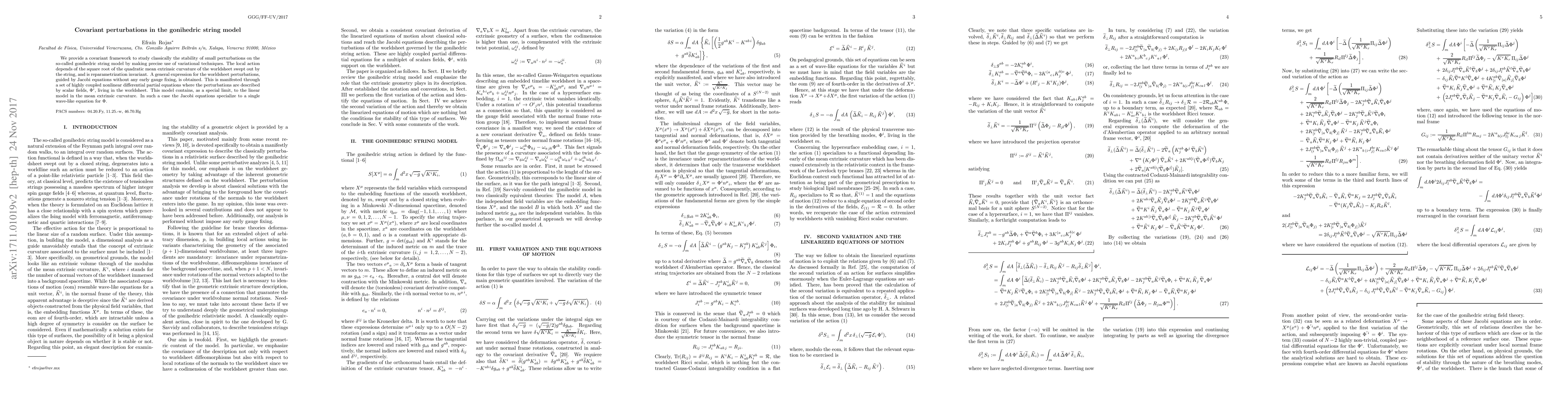 We provide a covariant framework to study classically the stability of small perturbations on the so-called gonihedric string model by making precise use of variational techniques. The local action depends of the square root of the quadratic mean extrinsic curvature of the worldsheet swept out by the string, and is reparametrization invariant. A general expression for the worldsheet perturbations, guided by Jacobi equations without any early gauge fixing, is obtained. This is manifested through a set of highly coupled nonlinear differential partial equations where the perturbations are described by scalar fields, $\Phi^i$, living in the worldsheet. This model contains, as a special limit, to the linear model in the mean extrinsic curvature. In such a case the Jacobi equations specialize to a single wave-like equation for $\Phi$.