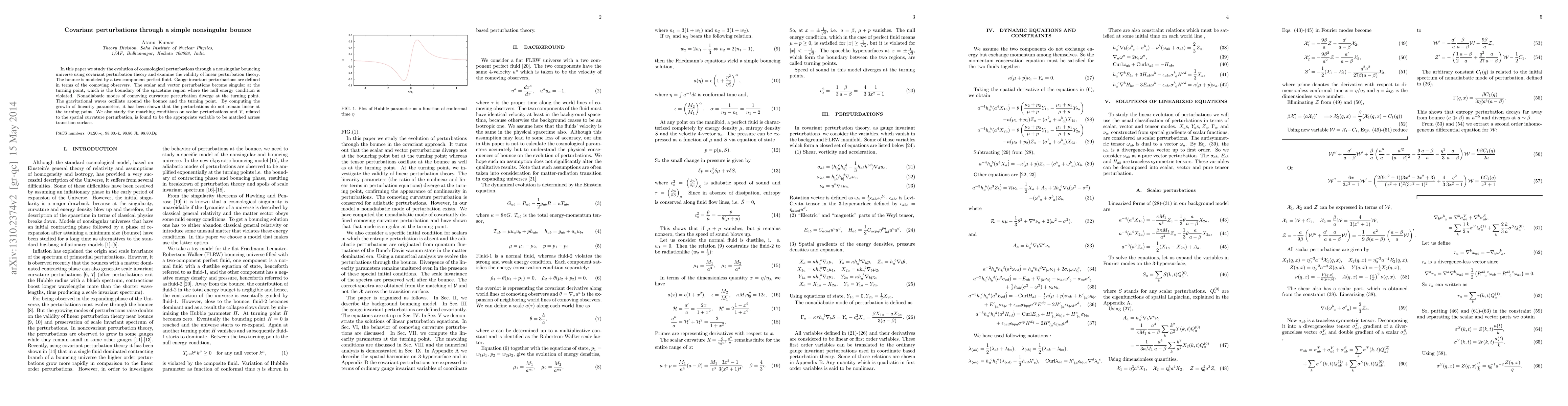 This paper investigates the evolution of cosmological perturbations through a nonsingular bouncing universe using covariant perturbation theory, revealing that scalar and vector perturbations become singular at the bounce, where the null energy condition is violated. It concludes that perturbations lose linearity at the turning point and identifies $\mv$ as the suitable variable for matching conditions across the transition surface.