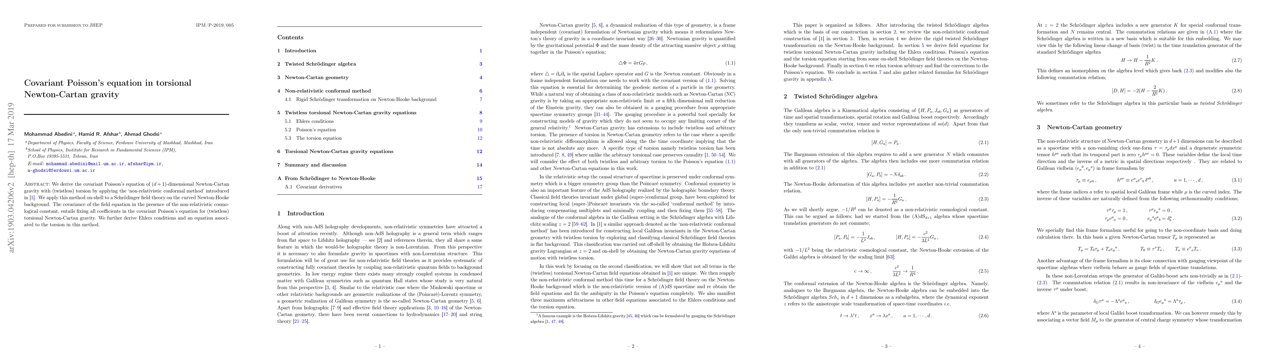 The paper derives the covariant Poisson's equation for (d+1)-dimensional torsional Newton-Cartan gravity using the non-relativistic conformal method, and applies it to Schrödinger field theory on a curved Newton-Hooke background. The method fixes coefficients in the equation and derives conditions related to torsion.