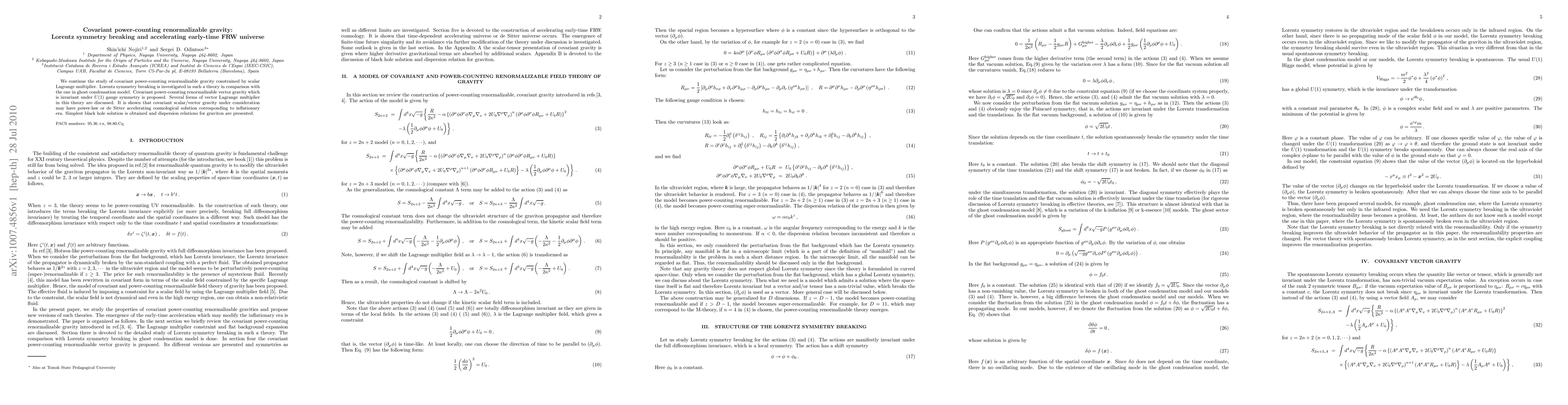 This paper explores covariant power-counting renormalizable gravity with a focus on Lorentz symmetry breaking and early-time accelerating FRW universe solutions. It proposes a new covariant vector gravity invariant under $U(1)$ gauge symmetry and discusses its potential for inflationary cosmological models.