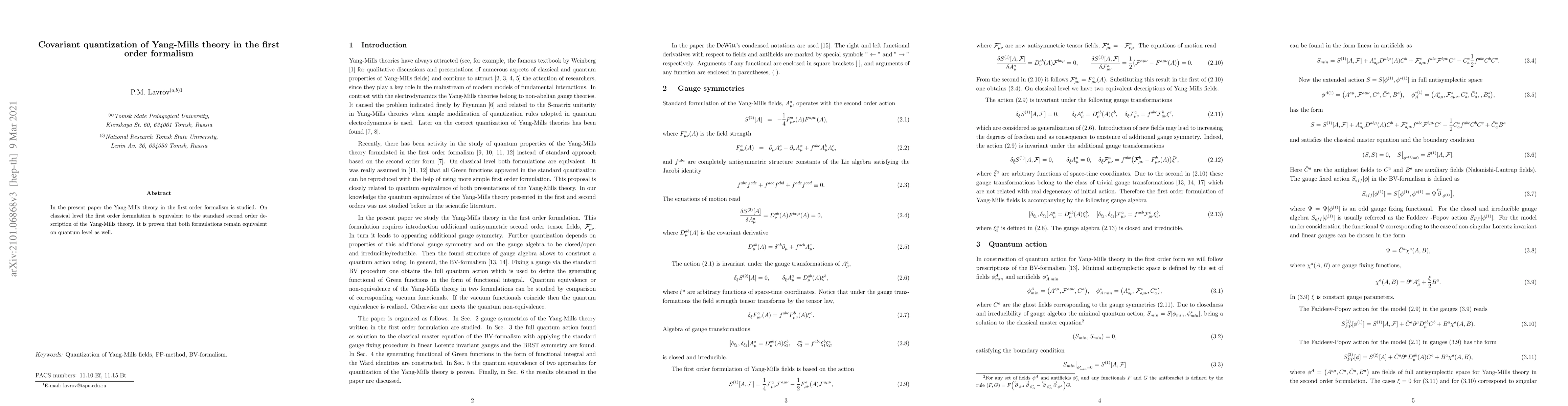 The paper explores the covariant quantization of Yang-Mills theory using the first order formalism, demonstrating equivalence between the first order and standard second order descriptions both classically and quantum mechanically.