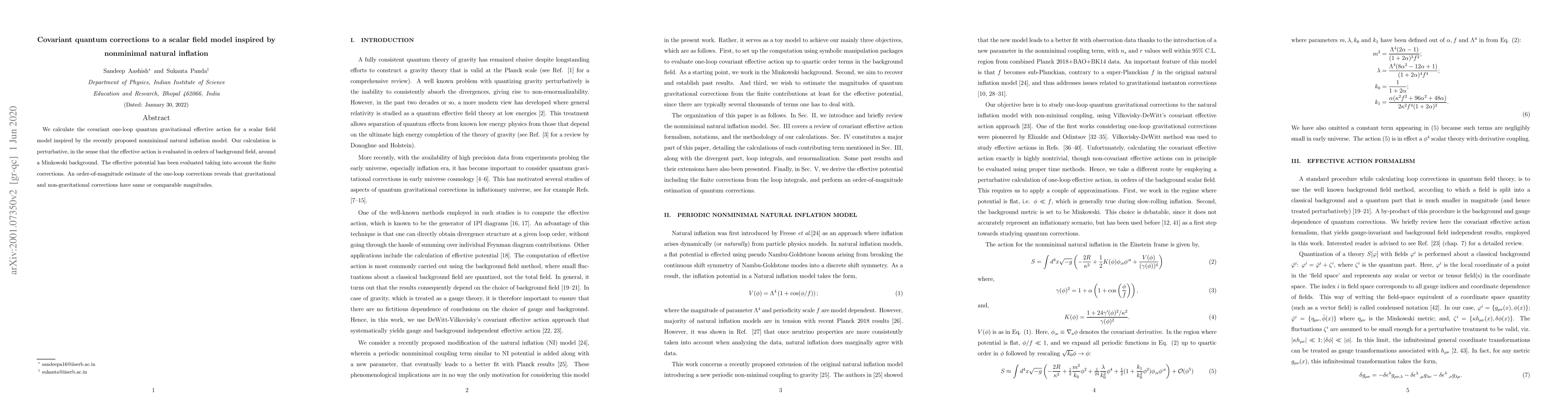 This paper calculates the covariant one-loop quantum gravitational effective action for a scalar field model based on nonminimal natural inflation, finding that gravitational and non-gravitational corrections are of similar magnitude. The effective potential is evaluated with finite corrections considered.
