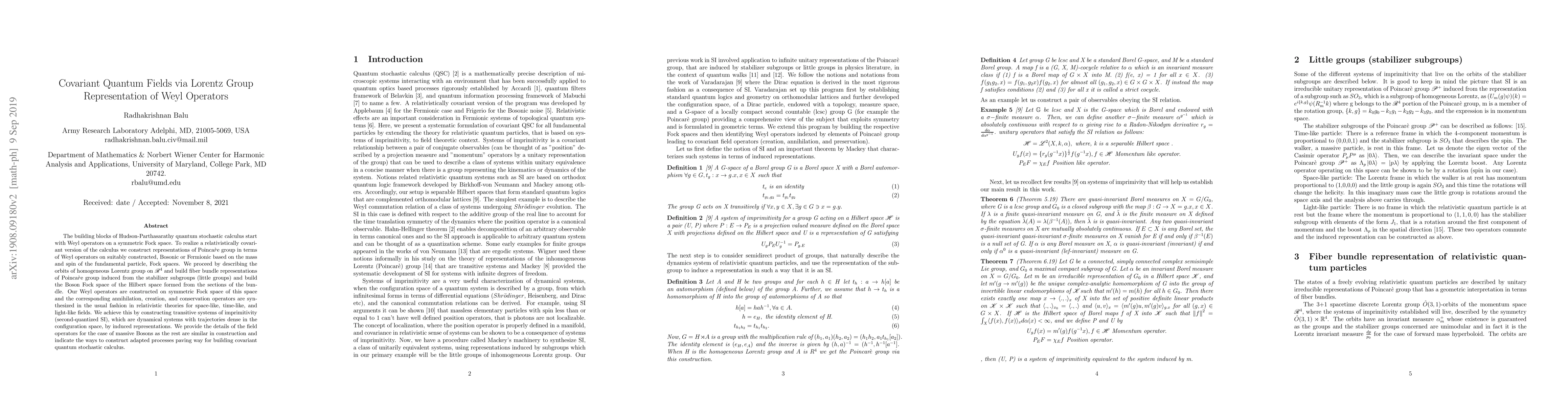 This paper constructs relativistically covariant quantum fields using representations of the Poincaré group based on Weyl operators in Fock spaces tailored for Bosons or Fermions. It details the construction of field operators for massive Bosons and outlines the method for building covariant quantum stochastic calculus.