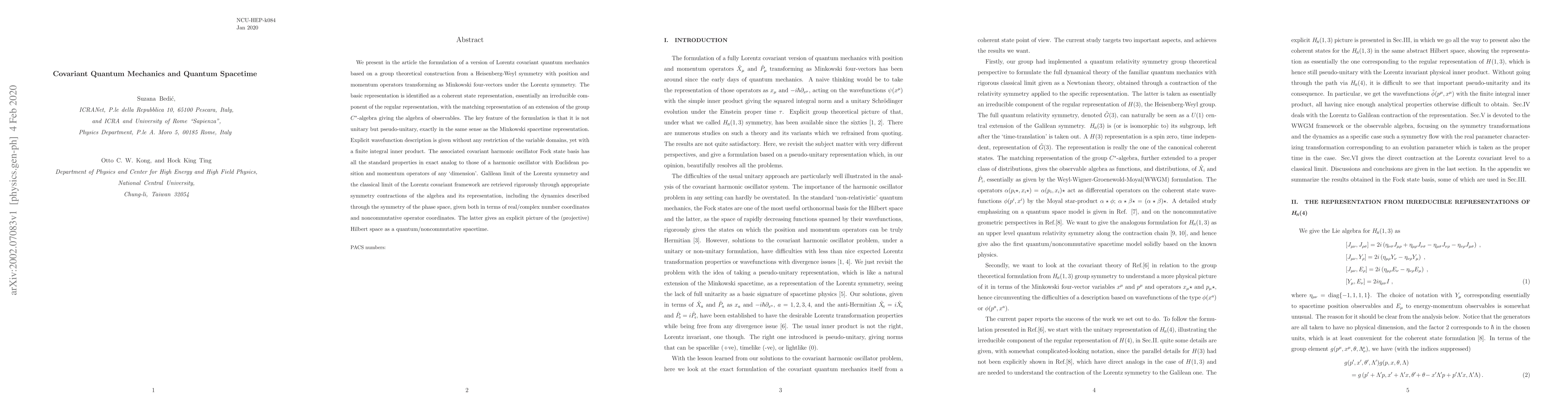 We present in the article the formulation of a version of Lorentz covariant quantum mechanics based on a group theoretical construction from a Heisenberg-Weyl symmetry with position and momentum operators transforming as Minkowski four-vectors under the Lorentz symmetry. The basic representation is identified as a coherent state representation, essentially an irreducible component of the regular representation, with the matching representation of an extension of the group $C^*$-algebra giving the algebra of observables. The key feature of the formulation is that it is not unitary but pseudo-unitary, exactly in the same sense as the Minkowski spacetime representation. Explicit wavefunction description is given without any restriction of the variable domains, yet with a finite integral inner product. The associated covariant harmonic oscillator Fock state basis has all the standard properties in exact analog to those of a harmonic oscillator with Euclidean position and momentum operators of any `dimension'. Galilean limit of the Lorentz symmetry and the classical limit of the Lorentz covariant framework are retrieved rigorously through appropriate symmetry contractions of the algebra and its representation, including the dynamics described through the symmetry of the phase space, given both in terms of real/complex number coordinates and noncommutative operator coordinates. The latter gives an explicit picture of the (projective) Hilbert space as a quantum/noncommutative spacetime.