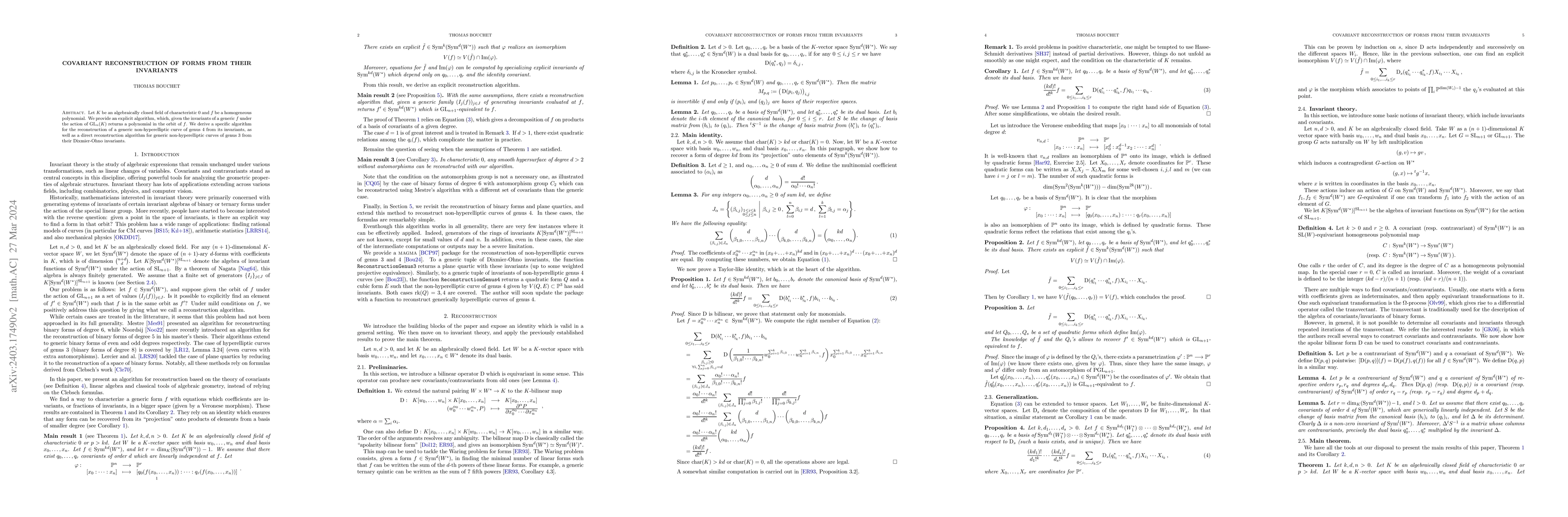 Let $K$ be an algebraically closed field of characteristic $0$ and $f$ be a homogeneous polynomial. We provide an explicit algorithm, which, given the invariants of a generic $f$ under the action of $\mathrm{GL}_n(K)$ returns a polynomial in the orbit of $f$. We derive a specific algorithm for the reconstruction of generic non-hyperelliptic curve of genus 4 from their invariants, as well as a direct reconstruction algorithm for generic non-hyperelliptic curves of genus 3 from their Dixmier-Ohno invariants.