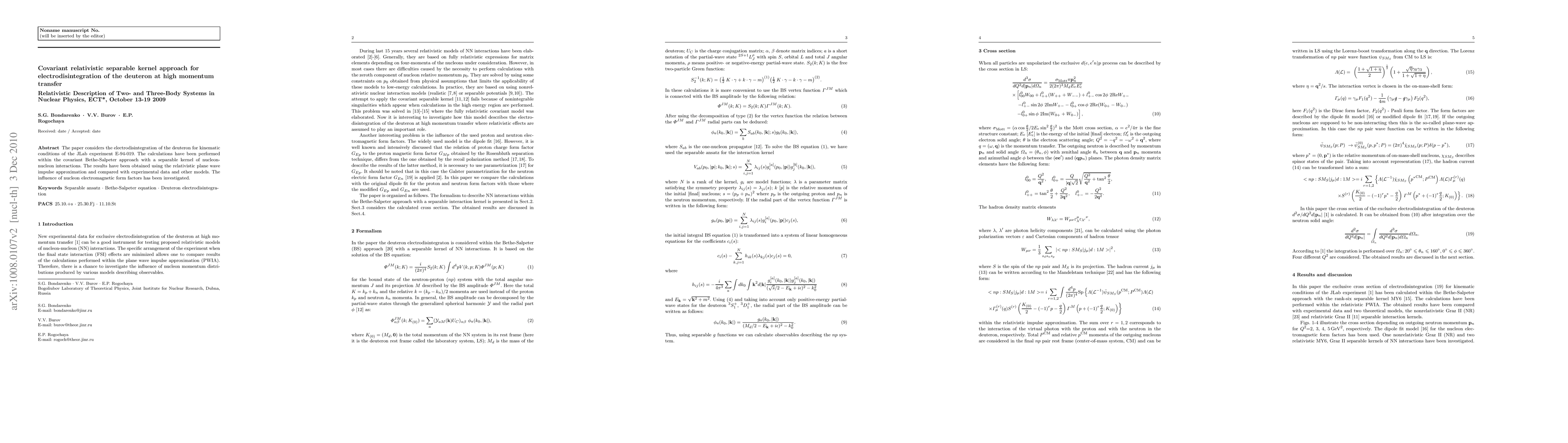 This paper employs a covariant relativistic separable kernel approach to study the electrodisintegration of the deuteron under high momentum transfer conditions, specifically for the JLab experiment E-94-019, and compares its results with experimental data and other theoretical models. The analysis also explores the impact of nucleon electromagnetic form factors.