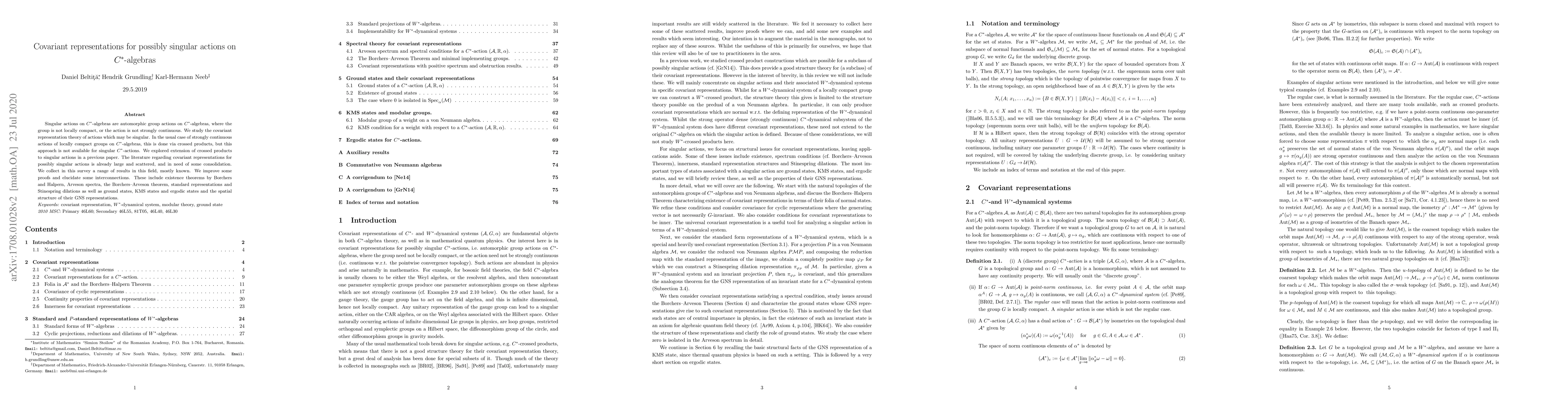 Singular actions on C*-algebras are automorphic group actions on C*-algebras, where the group need not be locally compact, or the action need not be strongly continuous. We study the covariant representation theory of such actions. In the usual case of strongly continuous actions of locally compact groups on C*-algebras, this is done via crossed products, but this approach is not available for singular C*-actions (this was our path in a previous paper). The literature regarding covariant representations for singular actions is already large and scattered, and in need of some consolidation. We collect in this survey a range of results in this field, mostly known. We improve some proofs and elucidate some interconnections. These include existence theorems by Borchers and Halpern, Arveson spectra, the Borchers-Arveson theorem, standard representations and Stinespring dilations as well as ground states, KMS states and ergodic states and the spatial structure of their GNS representations.