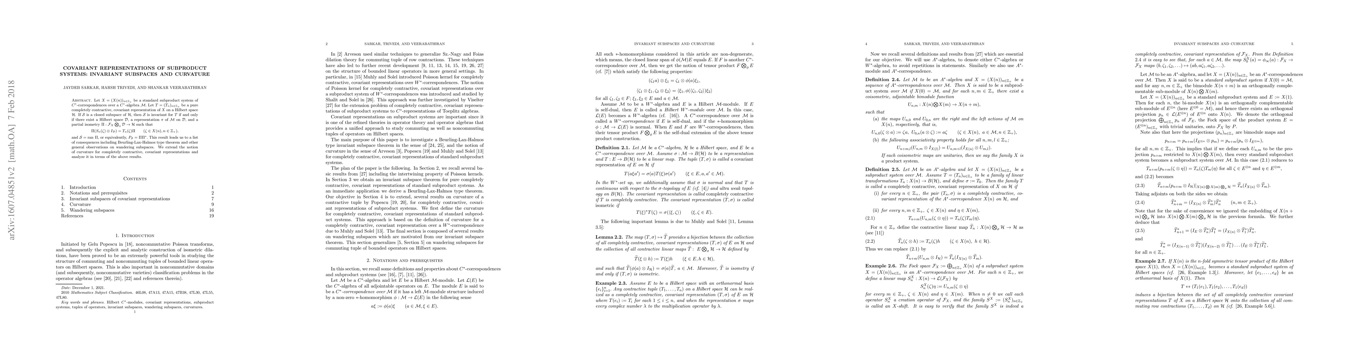 Let $X=(X(n))_{n \in \mathbb{Z_+}}$ be a standard subproduct system of $C^*$-correspondences over a $C^*$-algebra $\mathcal M.$ Assume $T=(T_n)_{n \in \mathbb{Z_+}}$ to be a pure completely contractive, covariant representation of $X$ on a Hilbert space $\mathcal H,$ and $\mathcal S$ to be a non-trivial closed subspace of $\mathcal H.$ Then $\mathcal{S}$ is invariant for $T$ if and only if there exist a Hilbert space $\mathcal{D},$ a representation $\pi$ of $\mathcal M$ on $\mathcal D,$ and a partial isometry $\Pi: \mathcal{F}_X\bigotimes_{\pi}\mathcal{D}\to \mathcal{H} $ such that $$\Pi (S_n(\zeta)\otimes I_{\mathcal{D}})=T_n(\zeta)\Pi~\mbox{whenever}~\zeta\in X(n), ~n\in \mathbb{Z_+},~\mbox{and}$$ $\mathcal S$ is the range of $\Pi,$ or equivalently, $P_{\mathcal S}=\Pi\Pi^*.$ This result leads us to many important consequences including Beurling type theorem and other general observations on wandering subspaces. We extend the notion of curvature for completely contractive, covariant representations and analyze it in terms of the above results.