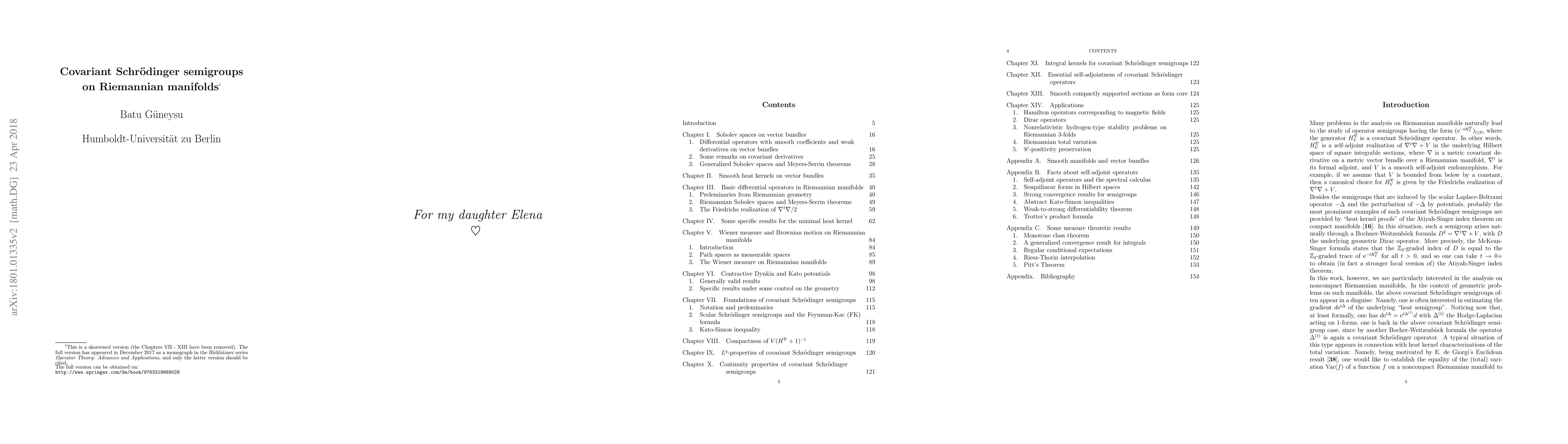 This monograph constructs the theory of covariant Schrödinger semigroups on noncompact Riemannian manifolds, exploring their properties, integral kernels, and applications in quantum mechanics and geometric analysis. It delves into Sobolev spaces, heat kernels, and differential operators, culminating in the essential self-adjointness of these semigroups.
