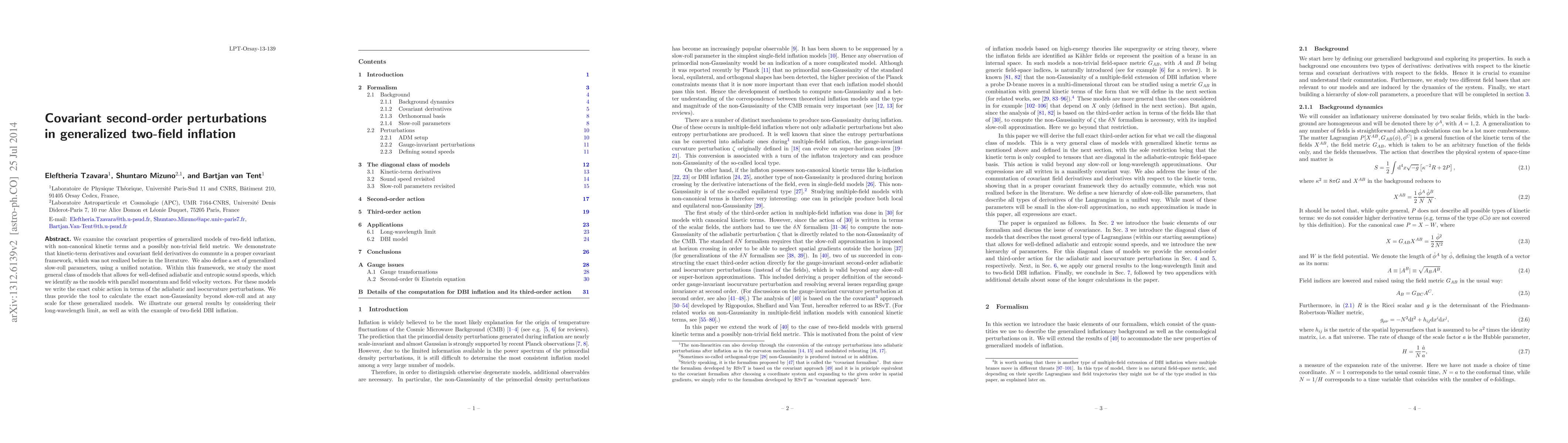 This research paper explores covariant properties of two-field inflation models with non-canonical kinetic terms and field metrics. It establishes that kinetic-term and covariant derivatives commute, introduces unified slow-roll parameters, and identifies models with parallel momentum and field velocity vectors for well-defined sound speeds. The paper also provides an exact cubic action for adiabatic and isocurvature perturbations, enabling non-Gaussianity calculation beyond slow-roll at any scale. Examples include the long-wavelength limit and two-field DBI inflation.