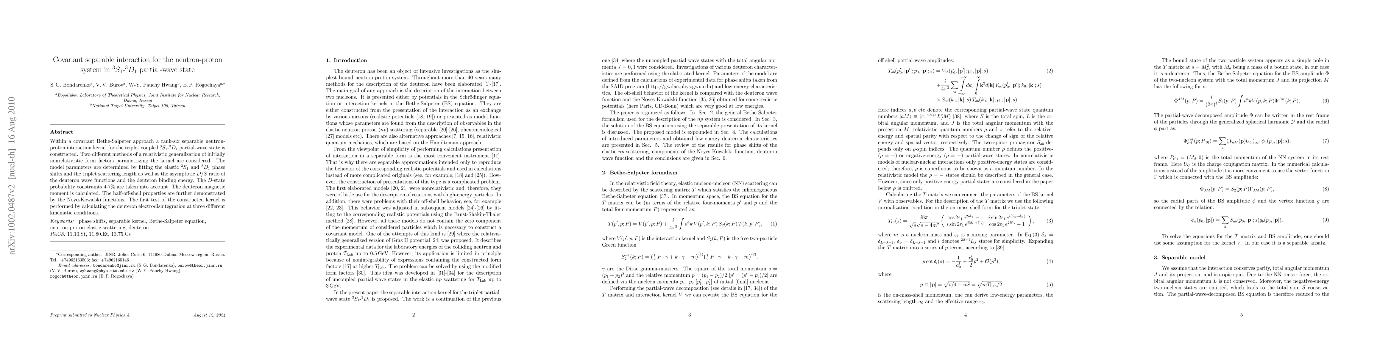 This paper constructs a covariant separable interaction kernel for the neutron-proton $^3S_1$-$^3D_1$ partial-wave state using a Bethe-Salpeter approach. The model fits various phase shifts and deuteron properties, and tests its kernel by calculating deuteron electrodisintegration.