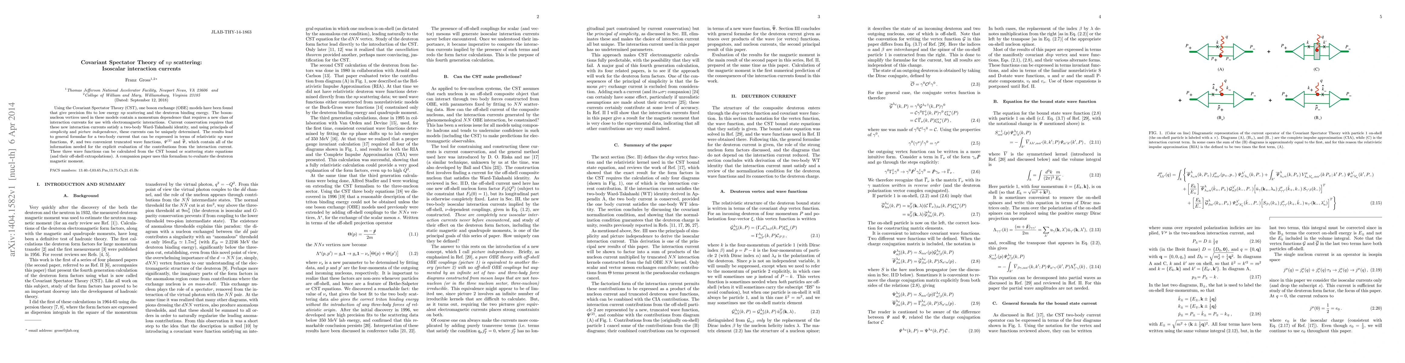 The Covariant Spectator Theory (CST) provides precision fits to low energy np scattering and deuteron binding energy through boson exchange models. The new interaction currents derived satisfy a two-body Ward-Takahashi identity and are expressed in terms of relativistic np wave functions and truncated wave functions, enabling explicit evaluation of interaction current contributions.
