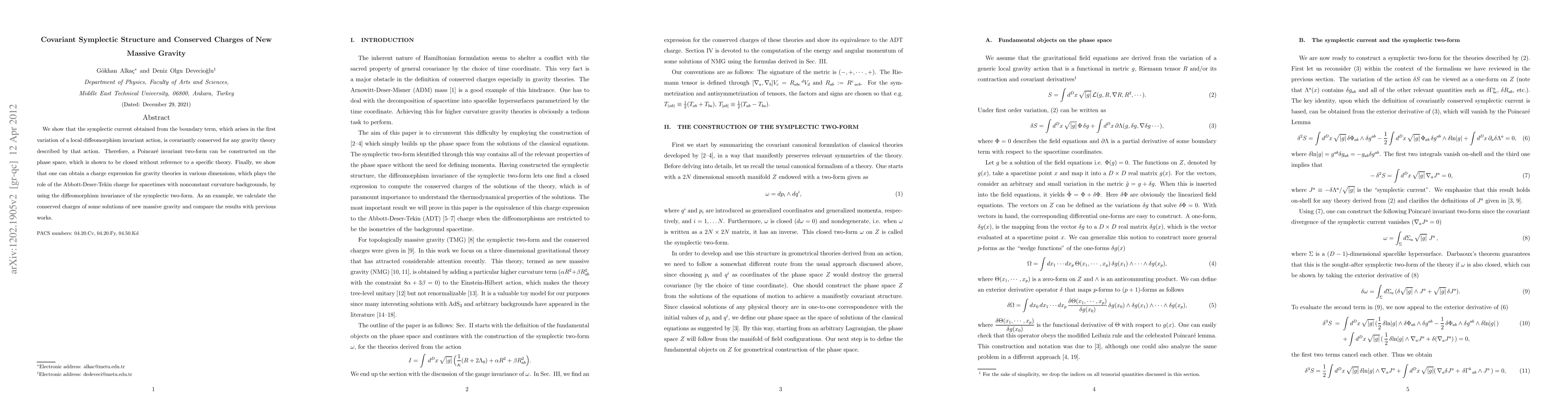 This paper demonstrates the covariant conservation of the symplectic current in gravity theories, constructing a Poincaré invariant 2-form on the phase space. It also derives conserved charges for gravity theories, exemplified by calculating conserved charges for solutions of New Massive Gravity, aligning with previous results.