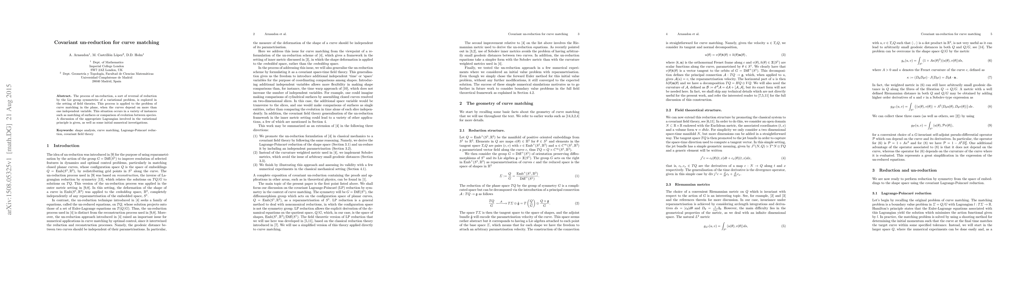 The process of un-reduction, a sort of reversal of reduction by the Lie group symmetries of a variational problem, is explored in the setting of field theories. This process is applied to the problem of curve matching in the plane, when the curves depend on more than one independent variable. This situation occurs in a variety of instances such as matching of surfaces or comparison of evolution between species. A discussion of the appropriate Lagrangian involved in the variational principle is given, as well as some initial numerical investigations.