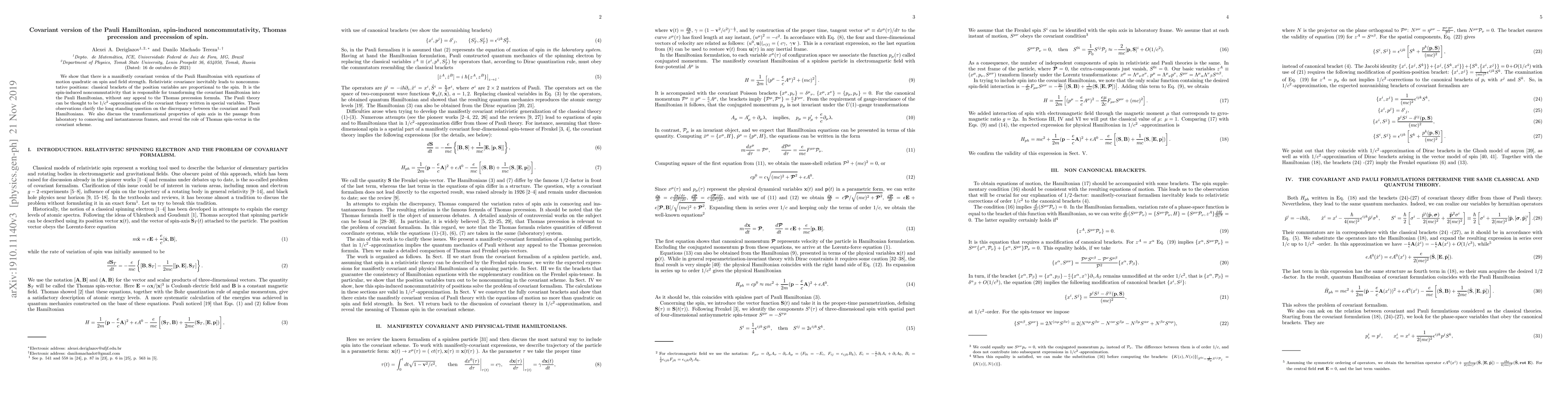 We show that there is a manifestly covariant version of the Pauli Hamiltonian with equations of motion quadratic on spin and field strength. Relativistic covariance inevitably leads to noncommutative positions: classical brackets of the position variables are proportional to the spin. It is the spin-induced noncommutativity that is responsible for transforming the covariant Hamiltonian into the Pauli Hamiltonian, without any appeal to the Thomas precession formula. The Pauli theory can be thought to be $1/c^2$ approximation of the covariant theory written in special variables. These observations clarify the long standing question on the discrepancy between the covariant and Pauli Hamiltonians. We also discuss the transformational properties of spin axis in the passage from laboratory to comoving and instantaneous frames, and reveal the role of Thomas spin-vector in the covariant scheme.