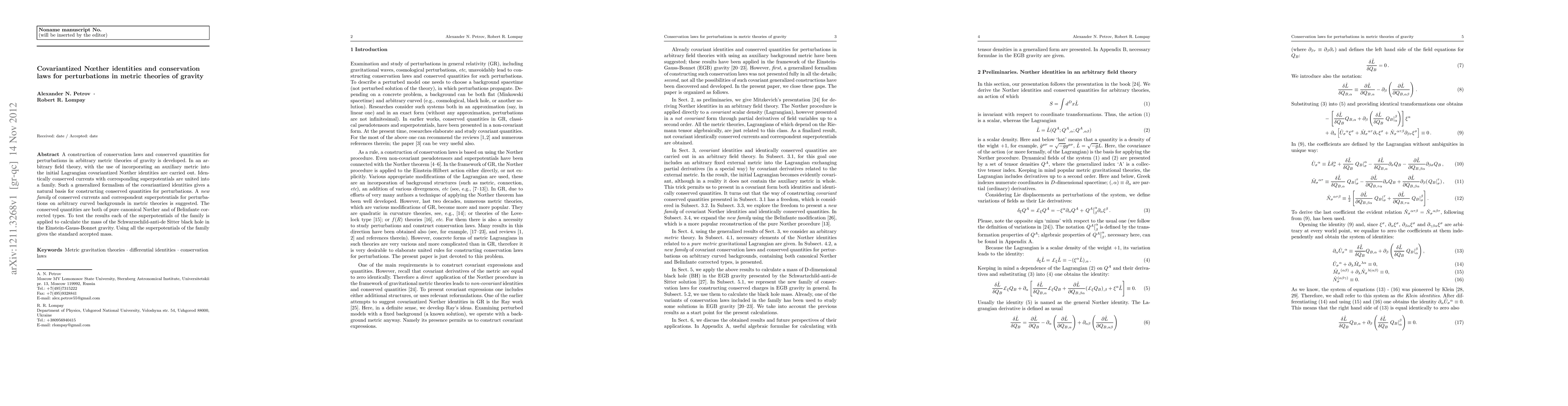 This paper develops a formalism for constructing conservation laws and conserved quantities for perturbations in metric theories of gravity by employing covariantized Noether identities and incorporating an auxiliary metric. It introduces a new family of conserved currents and superpotentials for perturbations on curved backgrounds, validating the approach by calculating the mass of a Schwarzschild-anti-de Sitter black hole in Einstein-Gauss-Bonnet gravity.
