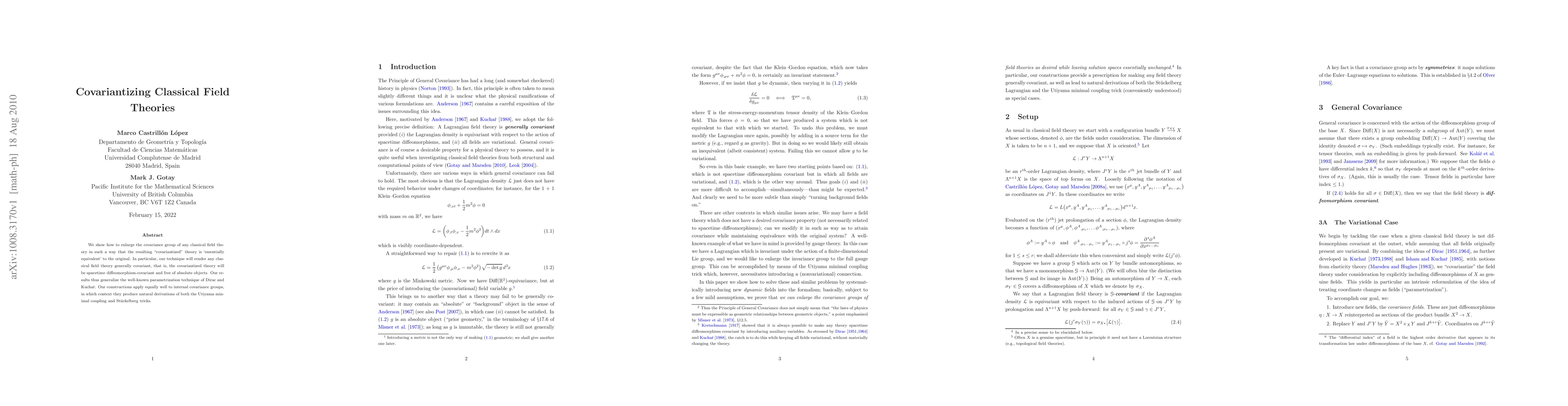 We show how to enlarge the covariance group of any classical field theory in such a way that the resulting "covariantized" theory is 'essentially equivalent' to the original. In particular, our technique will render any classical field theory generally covariant, that is, the covariantized theory will be spacetime diffeomorphism-covariant and free of absolute objects. Our results thus generalize the well-known parametrization technique of Dirac and Kucha\v{r}. Our constructions apply equally well to internal covariance groups, in which context they produce natural derivations of both the Utiyama minimal coupling and St\"uckelberg tricks.