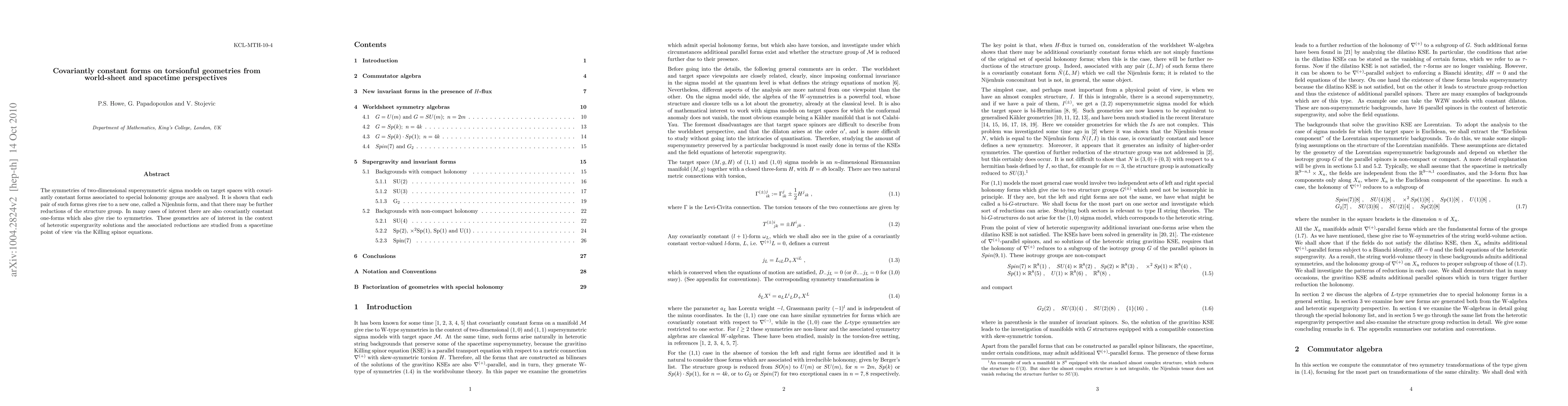 This paper analyzes the symmetries of two-dimensional supersymmetric sigma models on target spaces with covariantly constant forms linked to special holonomy groups, revealing the emergence of Nijenhuis forms and potential structure group reductions. The study also explores covariantly constant one-forms and their implications for heterotic supergravity solutions, with a focus on spacetime reductions via Killing spinor equations.