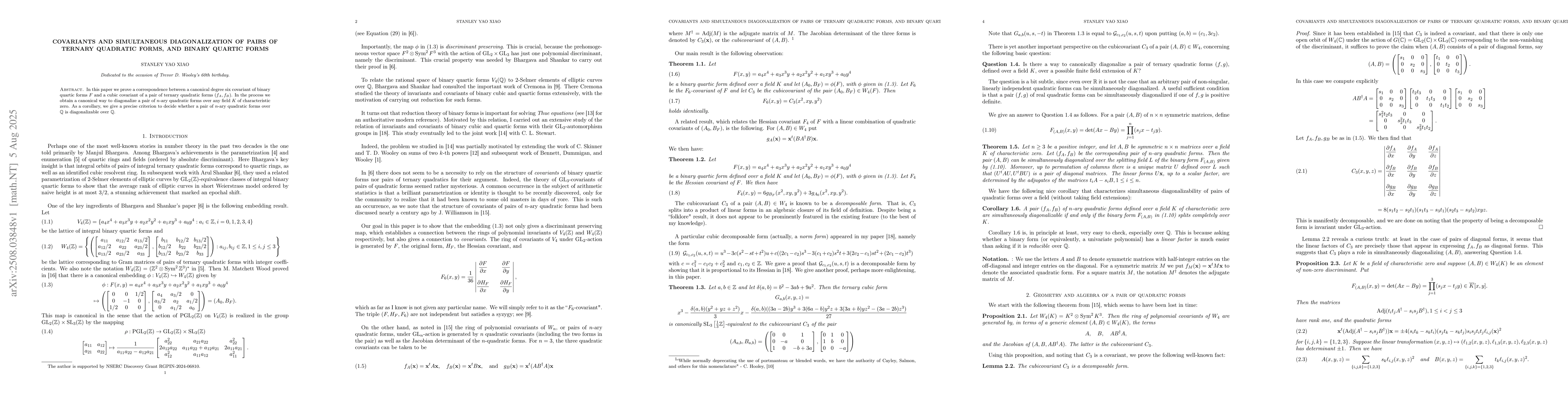 In this paper we prove a correspondence between a canonical degree six covariant of binary quartic forms $F$ and a cubic covariant of a pair of ternary quadratic forms $(f_A, f_B)$. In the process we obtain a canonical way to diagonalize a pair of $n$-ary quadratic forms over any field $K$ of characteristic zero. As a corollary, we give a precise criterion to decide whether a pair of $n$-ary quadratic forms over $\mathbb{Q}$ is diagonalizable over $\mathbb{Q}$.
