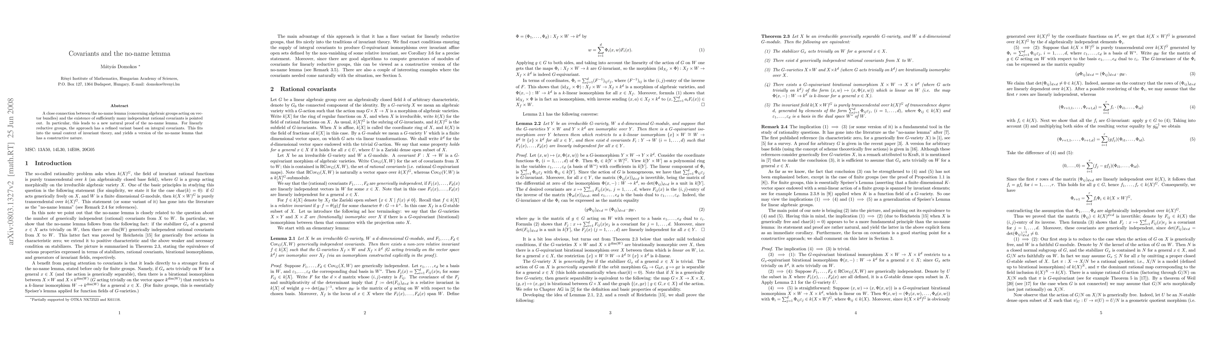 The paper establishes a connection between the no-name lemma and the existence of sufficiently many independent rational covariants, providing a new proof of the no-name lemma for linearly reductive groups using integral covariants.