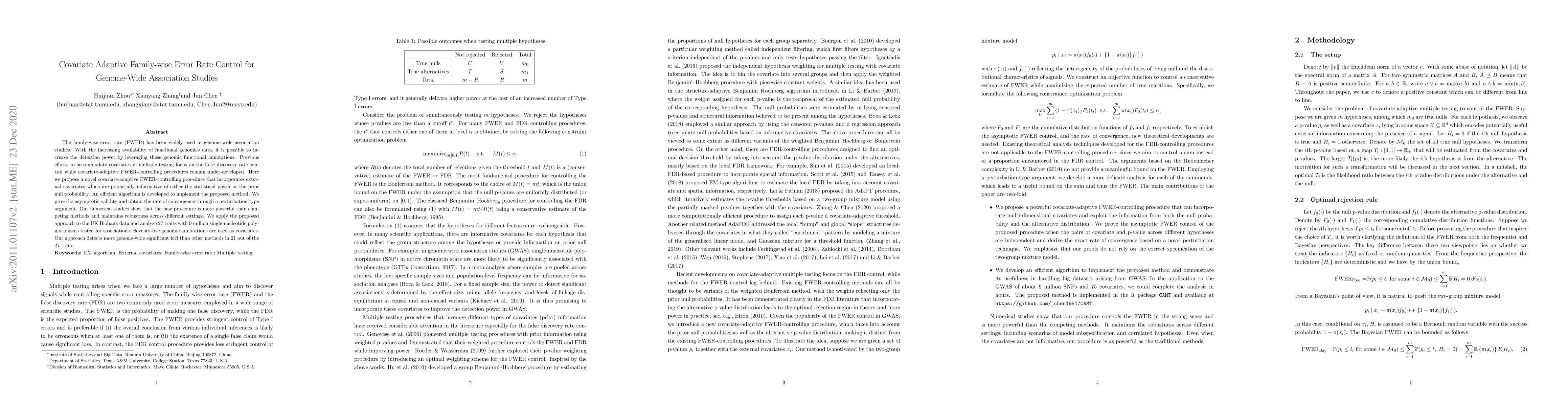 This paper proposes a novel covariate-adaptive FWER-controlling procedure for genome-wide association studies, incorporating external covariates to enhance detection power. The method is shown to be more powerful and robust than competing methods in numerical studies and real-data applications.