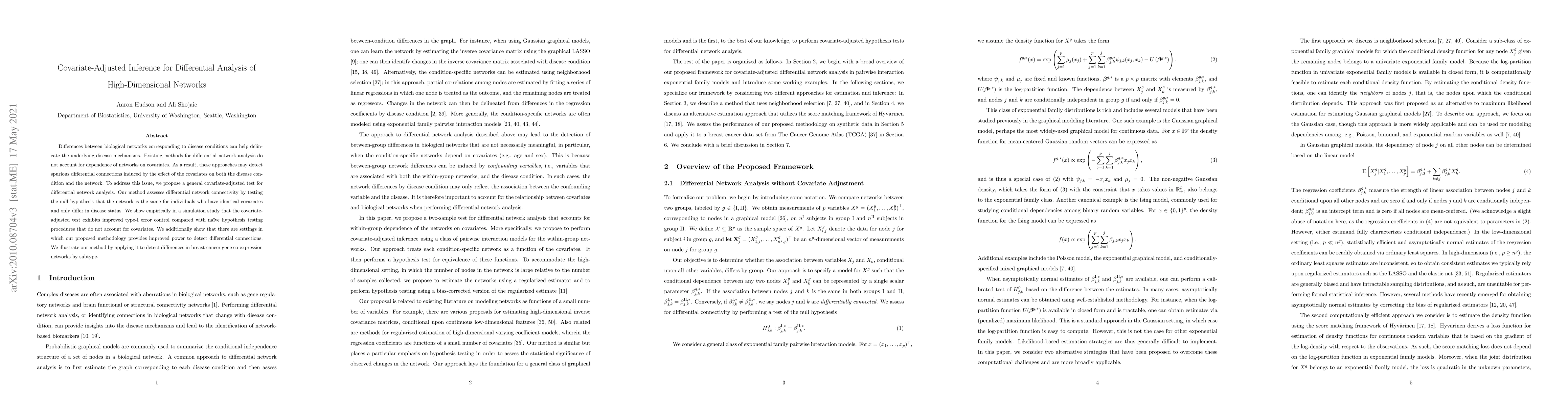 Differences between biological networks corresponding to disease conditions can help delineate the underlying disease mechanisms. Existing methods for differential network analysis do not account for dependence of networks on covariates. As a result, these approaches may detect spurious differential connections induced by the effect of the covariates on both the disease condition and the network. To address this issue, we propose a general covariate-adjusted test for differential network analysis. Our method assesses differential network connectivity by testing the null hypothesis that the network is the same for individuals who have identical covariates and only differ in disease status. We show empirically in a simulation study that the covariate-adjusted test exhibits improved type-I error control compared with na\"ive hypothesis testing procedures that do not account for covariates. We additionally show that there are settings in which our proposed methodology provides improved power to detect differential connections. We illustrate our method by applying it to detect differences in breast cancer gene co-expression networks by subtype.