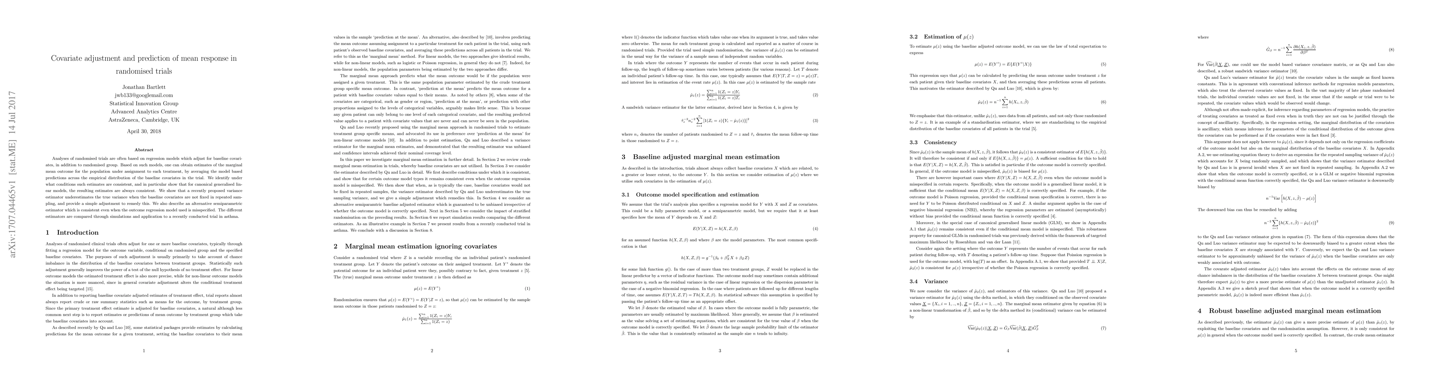 Analyses of randomised trials are often based on regression models which adjust for baseline covariates, in addition to randomised group. Based on such models, one can obtain estimates of the marginal mean outcome for the population under assignment to each treatment, by averaging the model based predictions across the empirical distribution of the baseline covariates in the trial. We identify under what conditions such estimates are consistent, and in particular show that for canonical generalised linear models, the resulting estimates are always consistent. We show that a recently proposed variance estimator underestimates the true variance when the baseline covariates are not fixed in repeated sampling, and provide a simple adjustment to remedy this. We also describe an alternative semiparametric estimator which is consistent even when the outcome regression model used is misspecified. The different estimators are compared through simulations and application to a recently conducted trial in asthma.